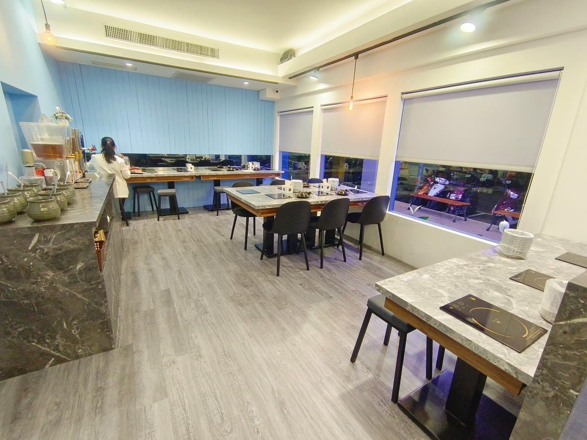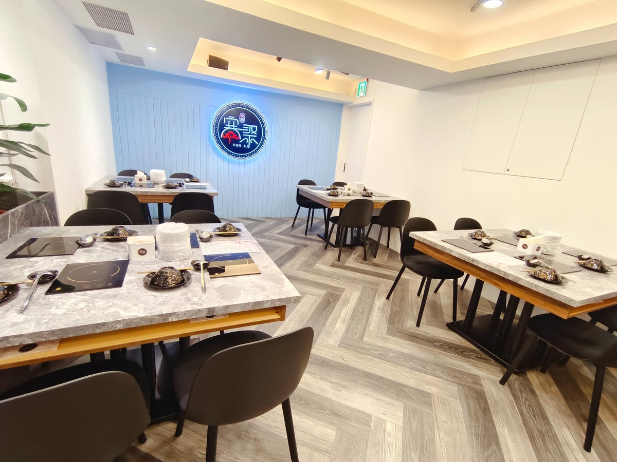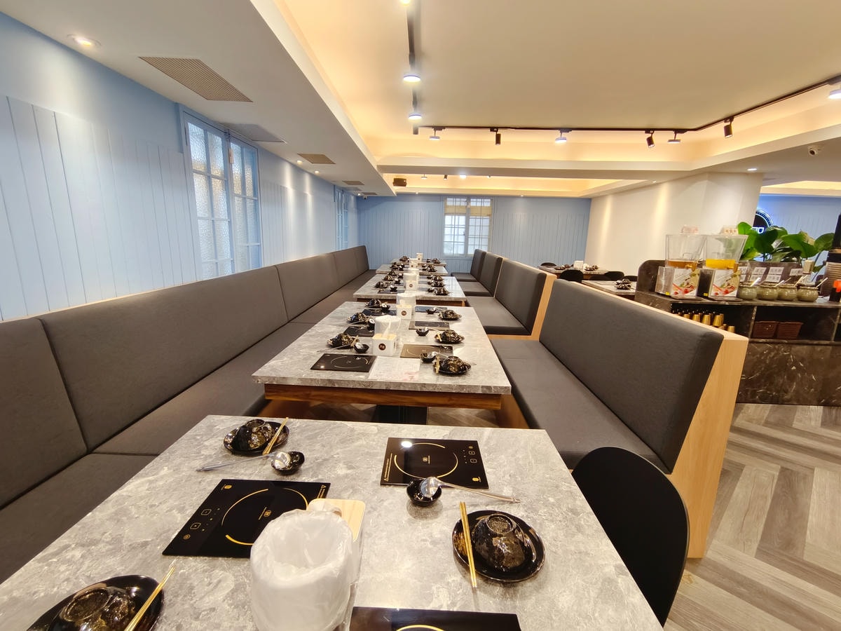 「寒聚精緻鍋物」有一樓和二樓的用餐區 , 冷氣開的很涼 , 大家不用擔心夏天吃火鍋會大汗小汗 , 我們吃到後面還請服務人員關小一點 (笑) , 一進入燈光明亮服務人員熱情 , 心情也跟著愉快起來 , 可以單人用餐也有多人數的位置 , 服務人員安排位在就可以準備開動了