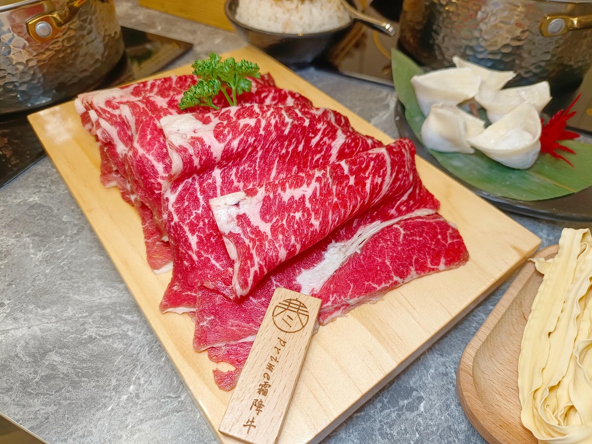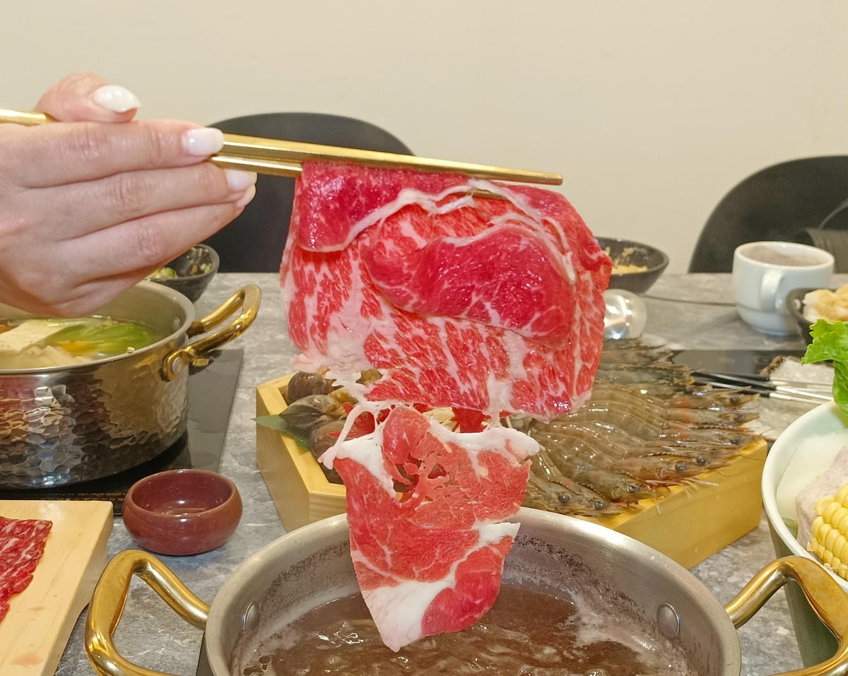 每片霜降牛肉~只要輕輕地在鍋裡涮約5秒鐘即可! 帶一點點血水 , 大約在7分熟的口感 ~ 最迷人 , 牛肉美味在嘴裡化開 , 口齒留香! 多汁甜美 , 讓人忍不住一口接著一口阿 !!
