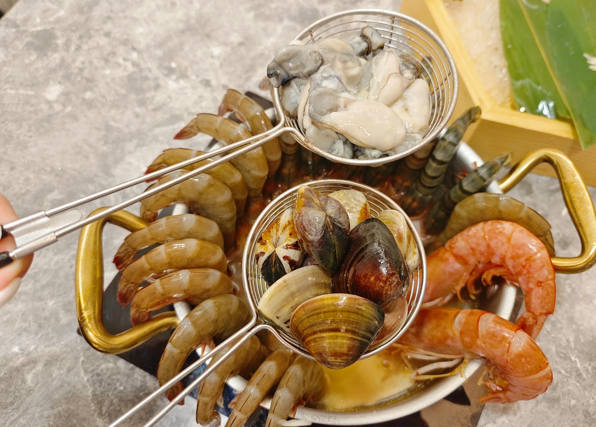 天使紅蝦2隻、南美甜白蝦12隻、海草蝦8隻、鮮蚵、現流海蛤
