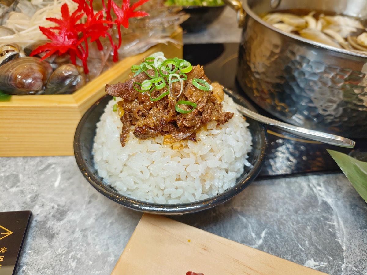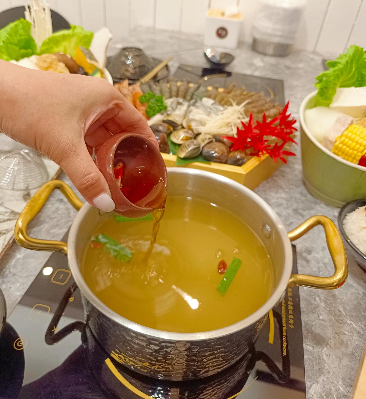 花雕雞還附上了一小碗的花雕酒 , 一加入香氣馬上撲鼻而來 , 會忍不住吞口水 , 甘甜香氣十足涮肉好提香 , 加入海鮮更顯鮮味 , 我好愛這湯頭哦 , 花雕酒可以再續加哦