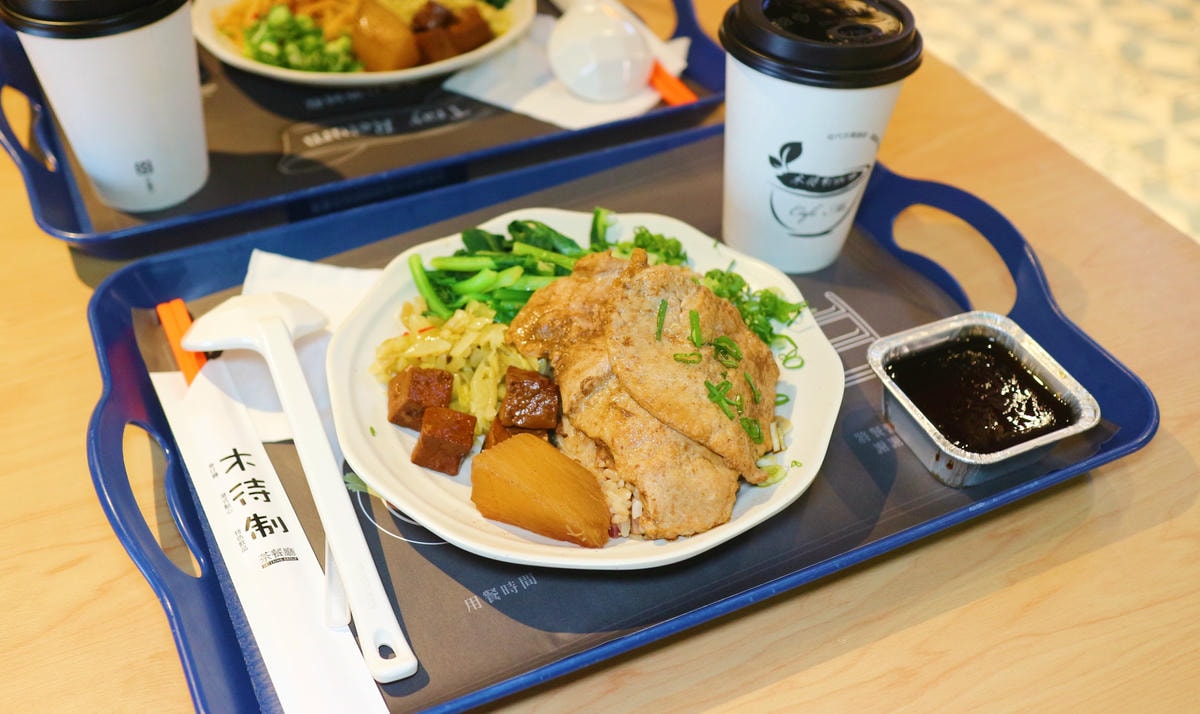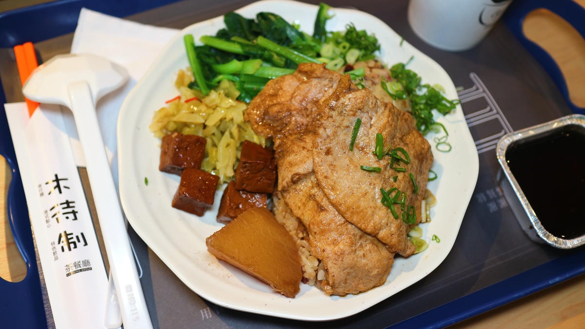 飯有點意思添加臘腸及港式風味的配料!胡椒粉讓味道更提升 , 米粒吸飽醬汁 , 臘肉油脂整個融入還真好吃!配菜豆干甜甜彈彈的 , 好合的的胃口 , 地完全抓住了我的胃口 , 那個里肌肉也未免太大一二塊了吧 , 有沒有賺錢啊!軟嫩Q彈 , 鹹香好入味 , 套餐CP值好高哦