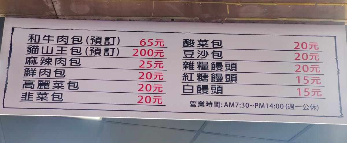 有超多種包子口味 , 鮮肉包、麻辣肉包、酸菜包、高麗菜包、韭菜包、豆沙包、雜糧饅頭、紅糖饅頭、白饅頭 , 每顆包子餡料都走一個浮誇澎湃路線 , 饅頭大又實在 , 價格卻非常樸實 , 大約落在15~25元左右 , 老上海包子還有買10送1的優惠活動 , 和牛肉包 , 貓山王包 , 會有獨立包裝 , 特別口味都要提前預定 , 可以先打電話過來預訂 , 嚐鮮一下