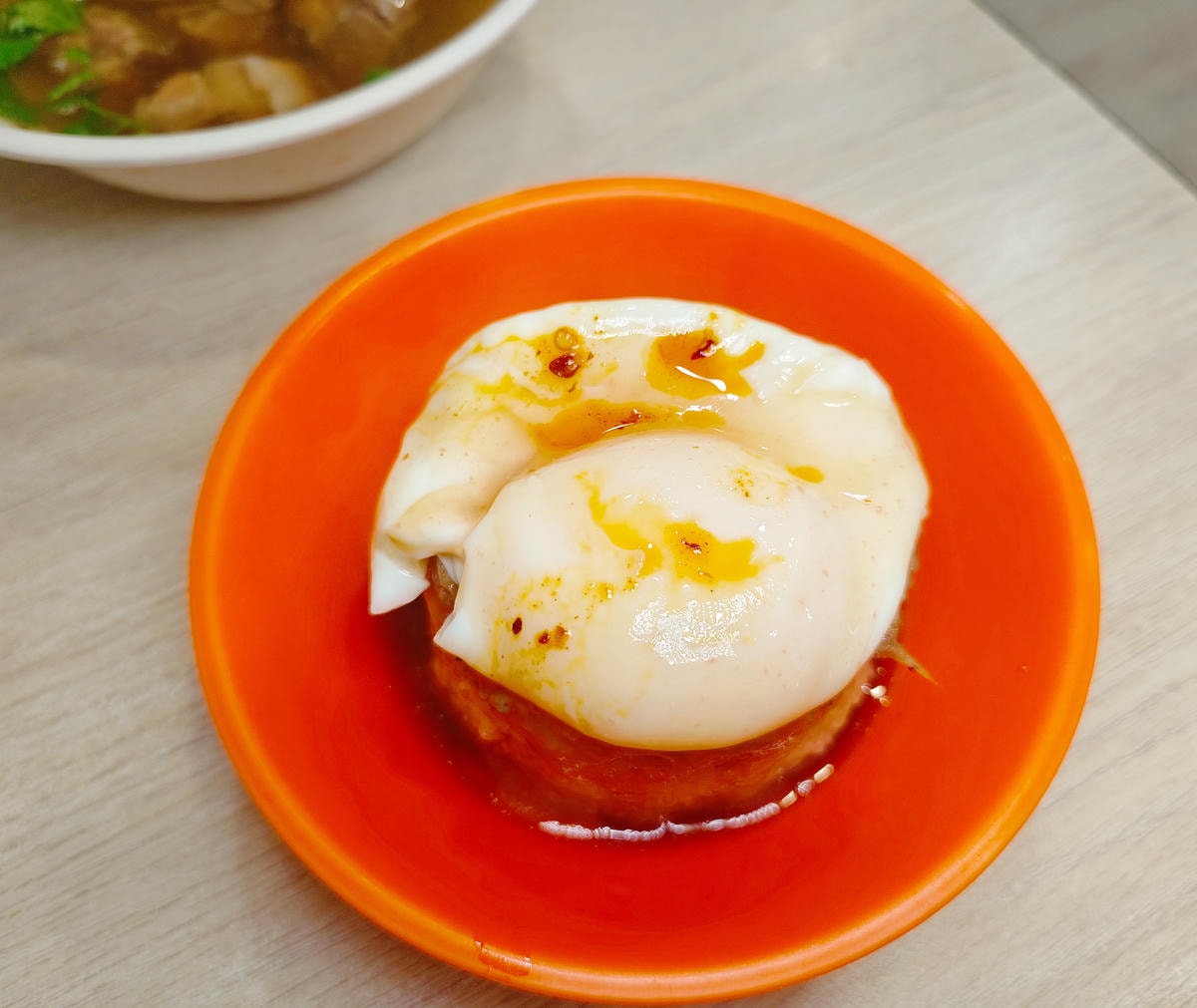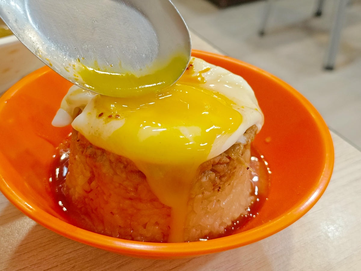 筒仔米糕口感吃起來濕潤卻又不黏牙 , 點顆半熟的水煮蛋(也可以選擇全熟) , 蛋黃和米飯融合一起更滑順更有香味 , 沾醬甜甜和辣油美味度也升級!