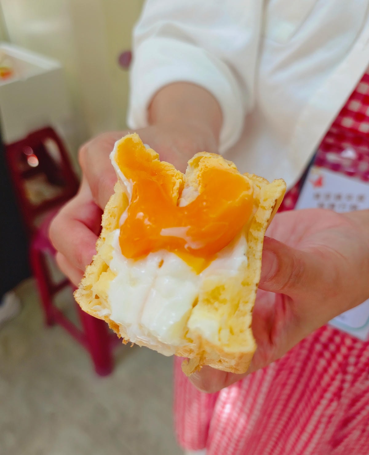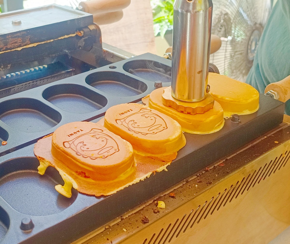 而雞蛋糕上層烙印上可愛的圖樣 , 讓人好捨不得吃掉它