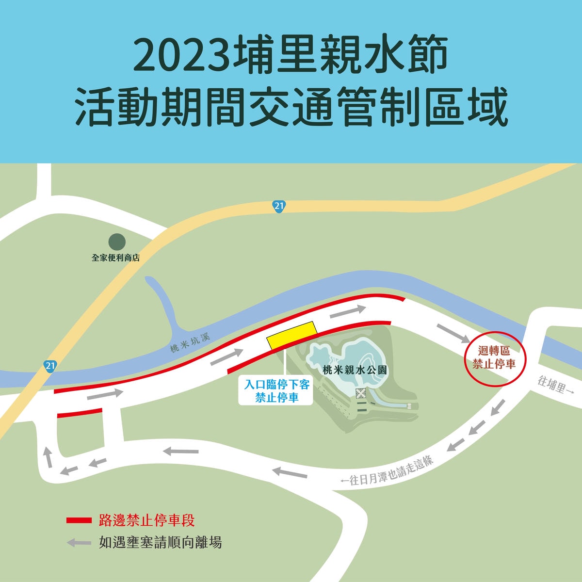 2023埔里親水節的活動會場位在「桃米親水公園」 , 活動期間交通管制區堿如下 , 開車的朋友可以停在附近的收費停車場 , 步行走到會場大約3-4分鐘 , 延路可以欣賞週邊的自然景觀 , 拍照作記念