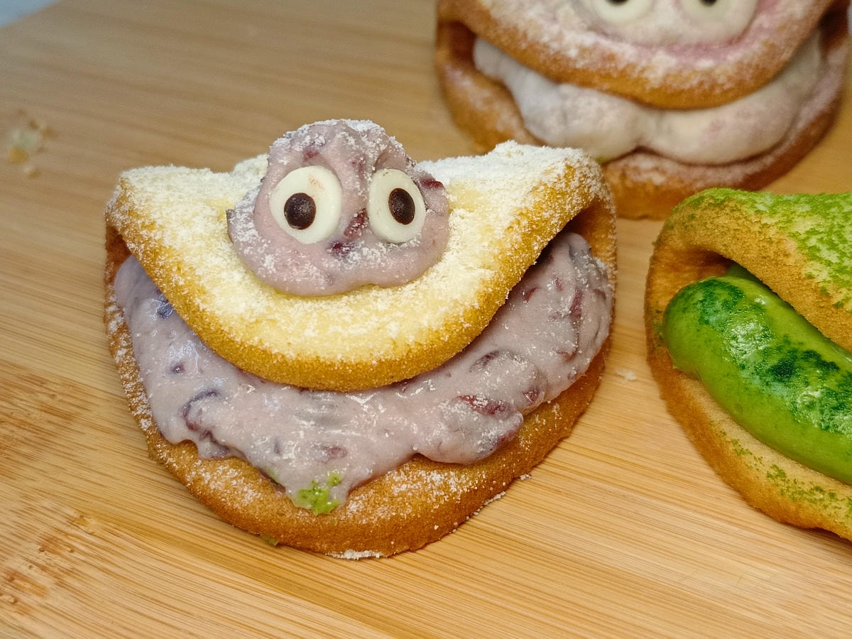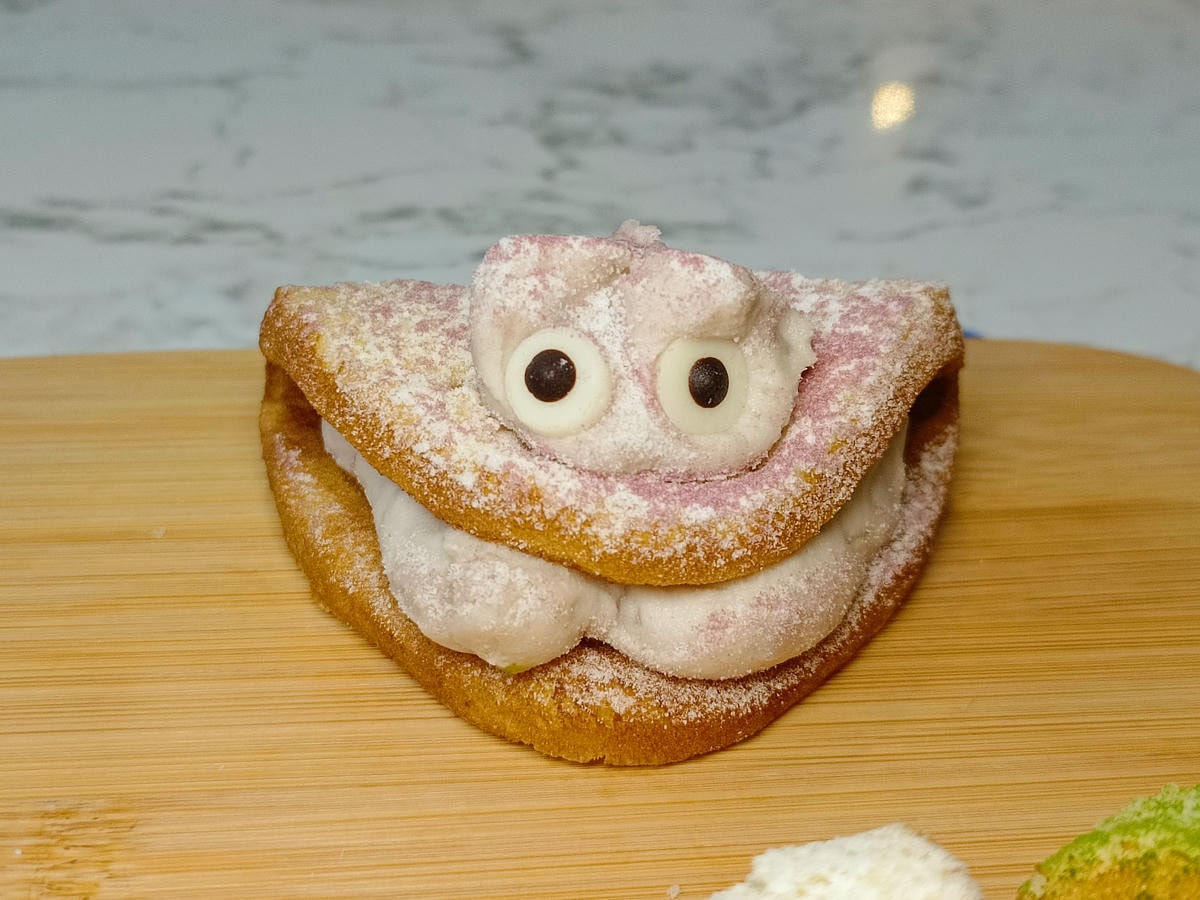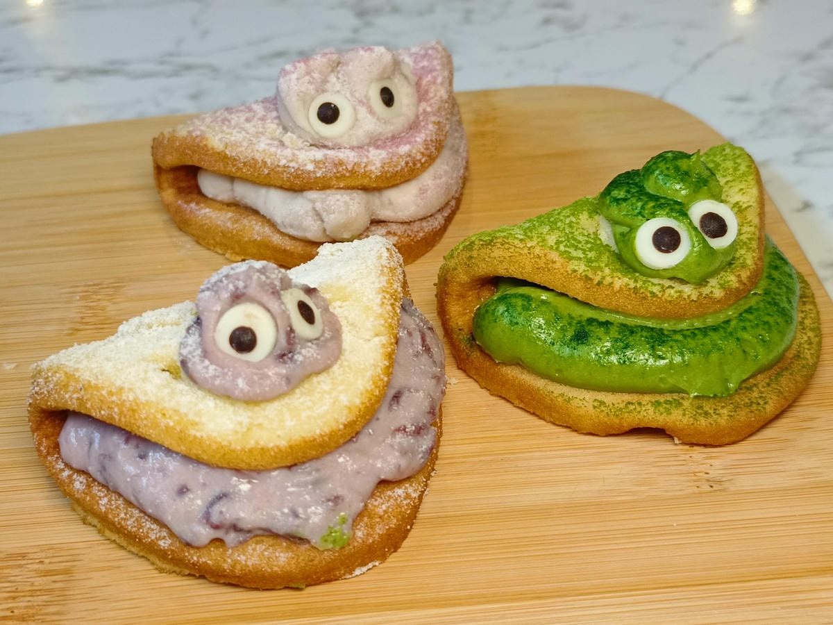 鬆軟綿密的蛋糕體 (有一點鯛魚燒的口感 ) , 夾入滿溢又濃郁的招牌滿出來的餡料 , 外層再放上一球髒髒怪的可愛頭 , 接著在上頭用力的撒上滿滿各式粉料 , 最後貼上可愛級了的圓圓眼睛 , 髒髒燒不只有顏值也好吃 , 收買大人小孩的心 , 讓一口接著一口吃 , 完全停不下來
