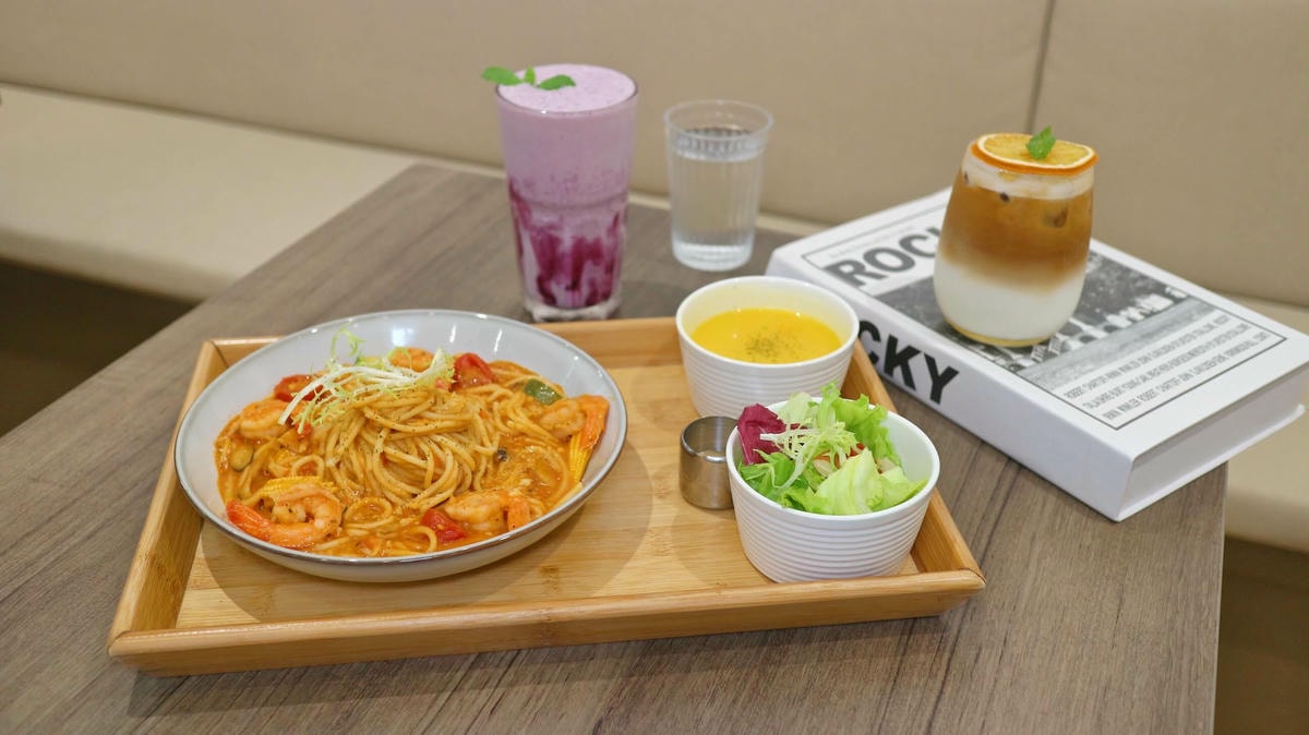 美有計劃Cafe菜單有早午餐、義大利麵、燉飯、薄餅、沙拉、湯品 , 還有精緻又好好吃的舒芙蕾可以選擇 , 飲品有咖啡、茶類、果惜冰沙 , 餐點加60元還可以升級咖啡優惠哦!