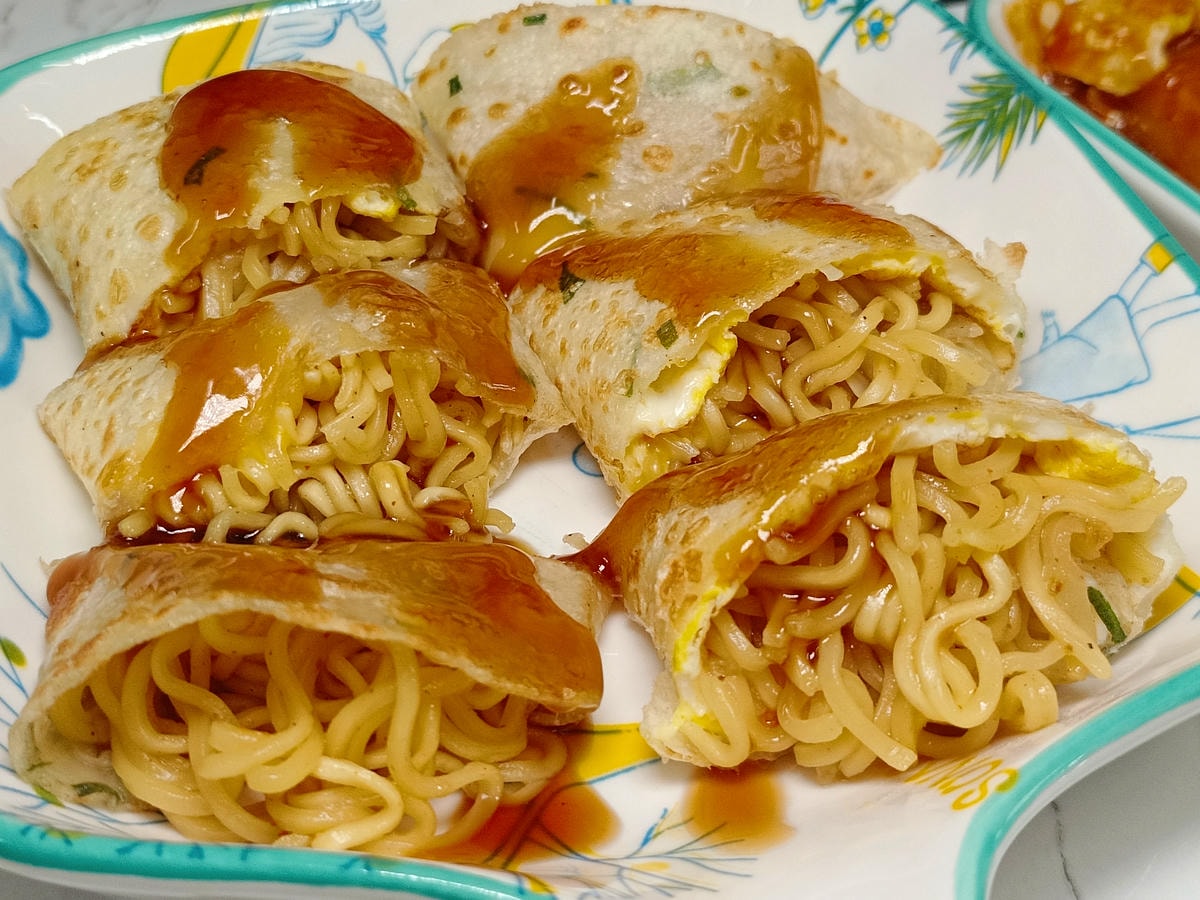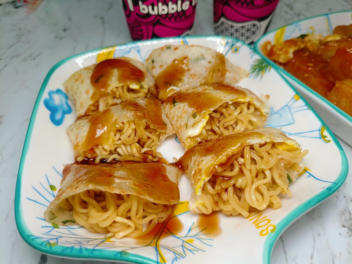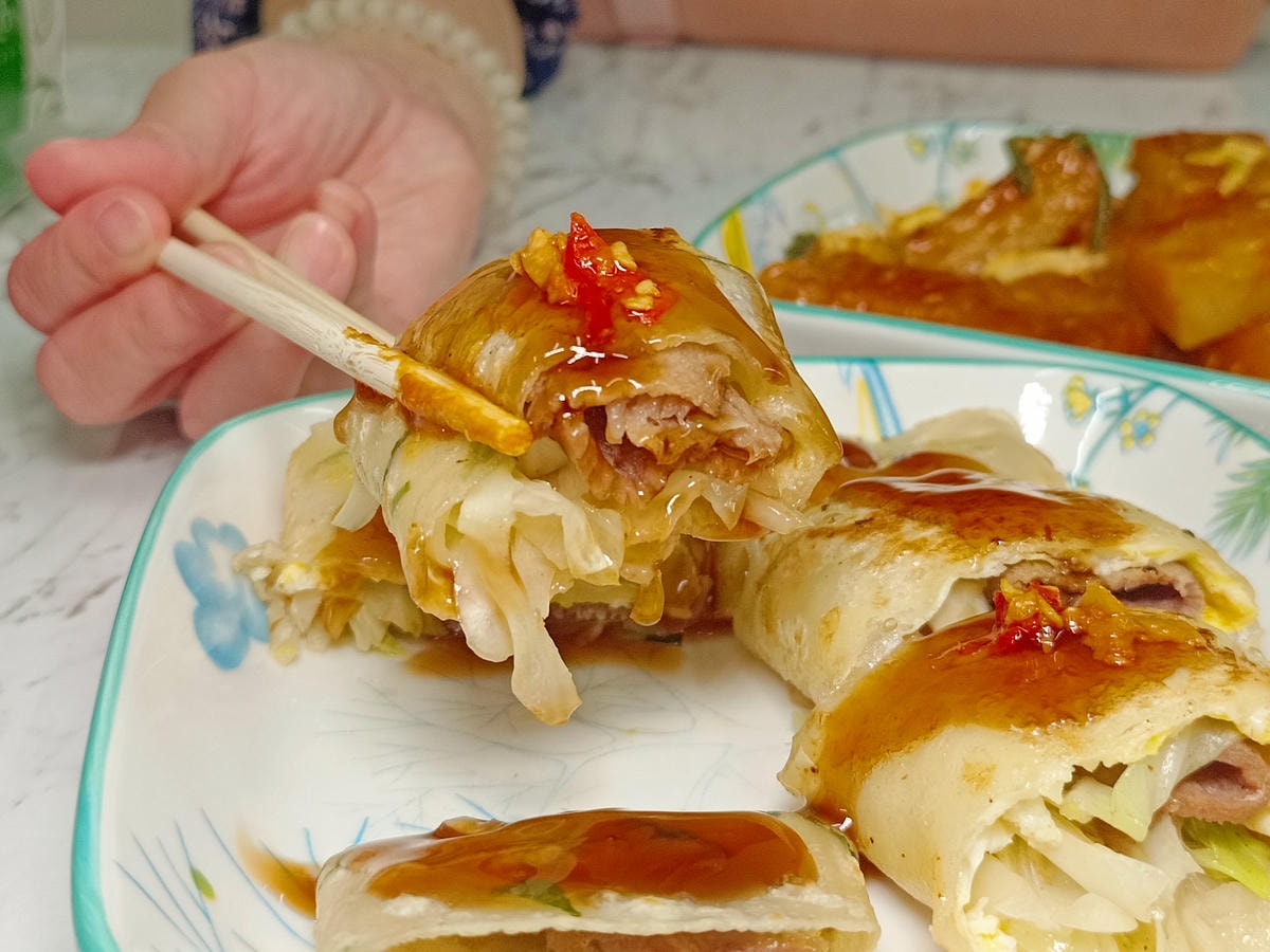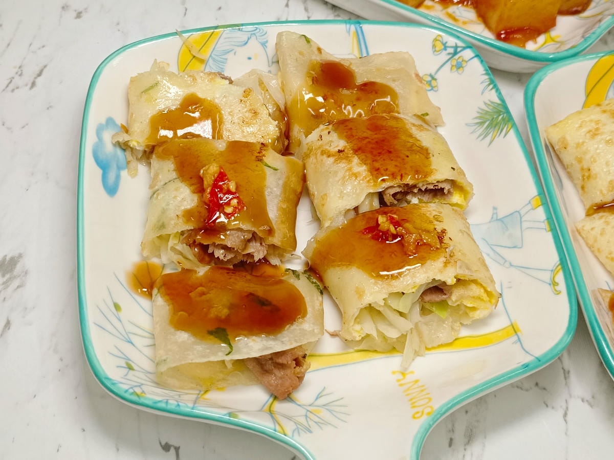 加入了高麗菜增添清甜口感、好吃的燒肉肥瘦適中 , Q彈蛋餅將餡料包裹起來 , 一口咬下香氣湧上 , 吃起來很嫩很香 , 沾上店家自製的調醬好對味