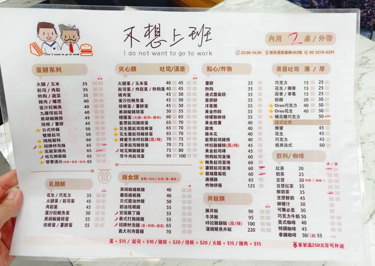 這間位於新北市新莊區新泰路上的「不想上班早午餐 新莊店」 是一間相當推薦的新莊泰山美食以及三更半夜突然想吃早餐的好選擇 , 店內不只販售早餐也有飯和麵的品項很豐富 , 經營五年已是在地人天天上門報到的早午餐店 , 份量十足算是一間超高 CP 值 , 讓人一吃想在來的店!