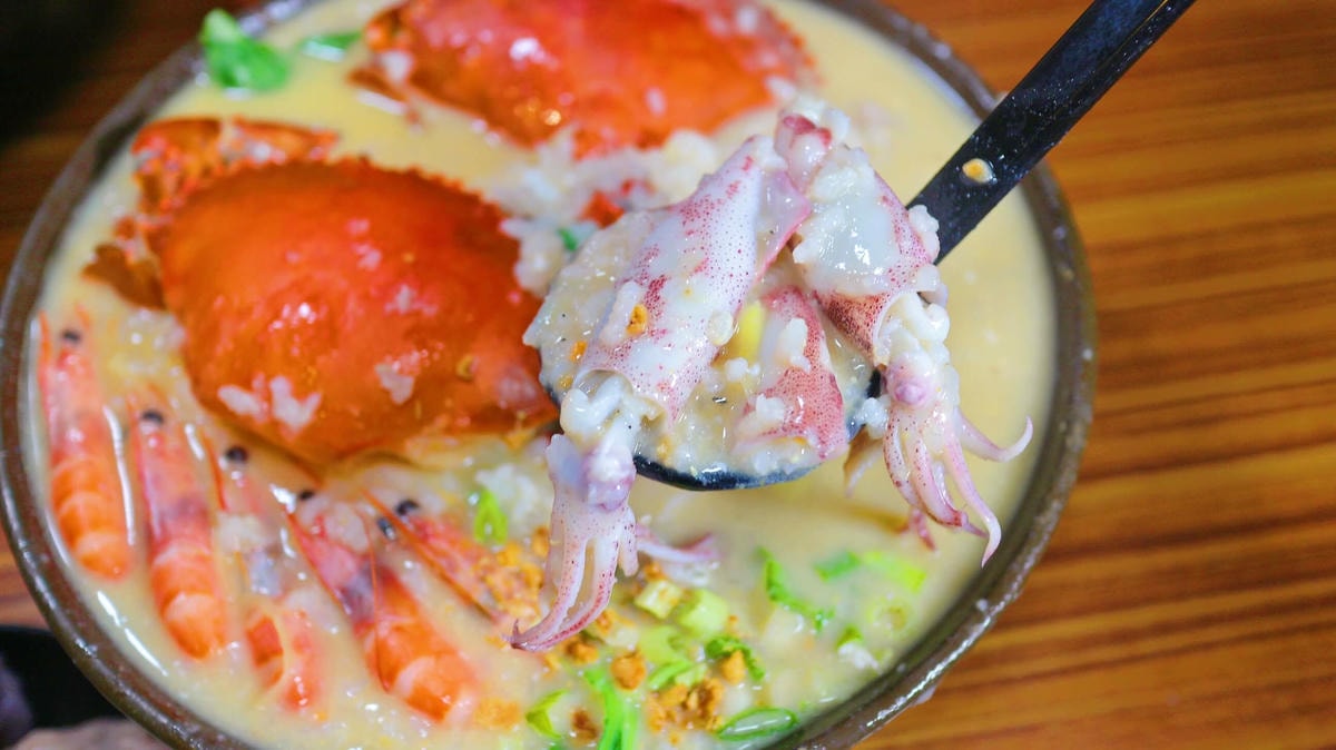 他們家的餐點可是出了名的澎湃又浮誇 , 他們家的海味粥真的超推的 , 兩隻紅蟳躺在大碗的粥品上 , 滿滿的海鮮讓人看了很心動
