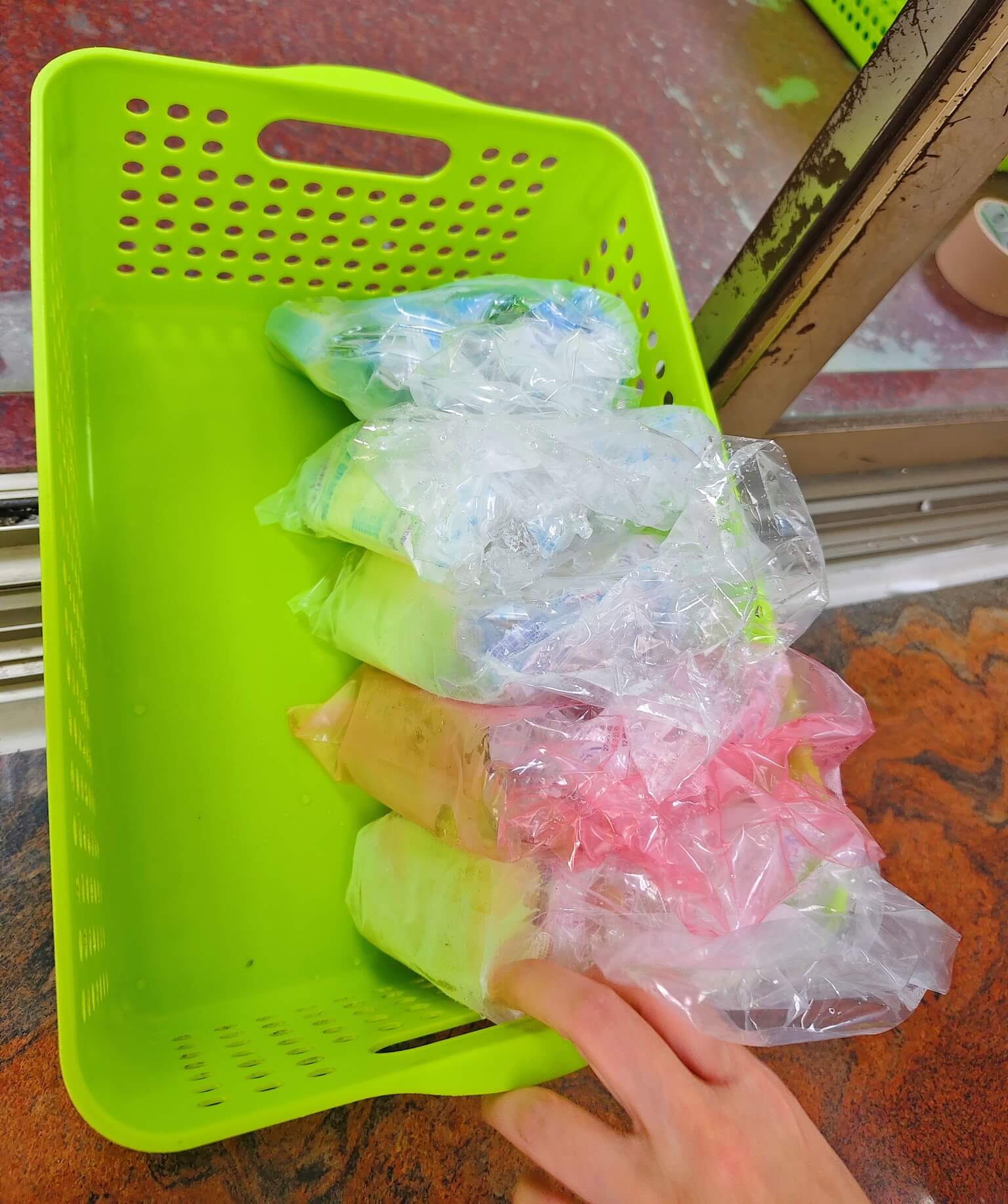 古早味枝仔冰一袋五枝 , 不零售 , 價格大多都落在75元 , 只有花生、芒果口味是90元 , 現場有保麗龍箱可加購 , 一個25元 , 很多熟客客人都是自己帶保冰袋來裝