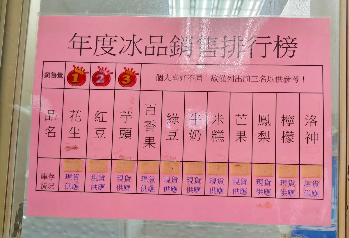第一次來的朋友 , 可以參考年度冰品 , 前3名人氣王是 花生、紅豆、芋頭 , 而百香果、綠豆、牛奶、米糕、檸檬、芒果、鳳梨、洛神口味