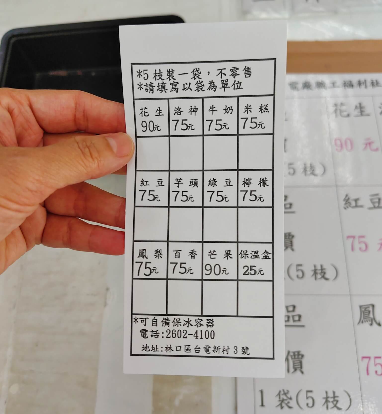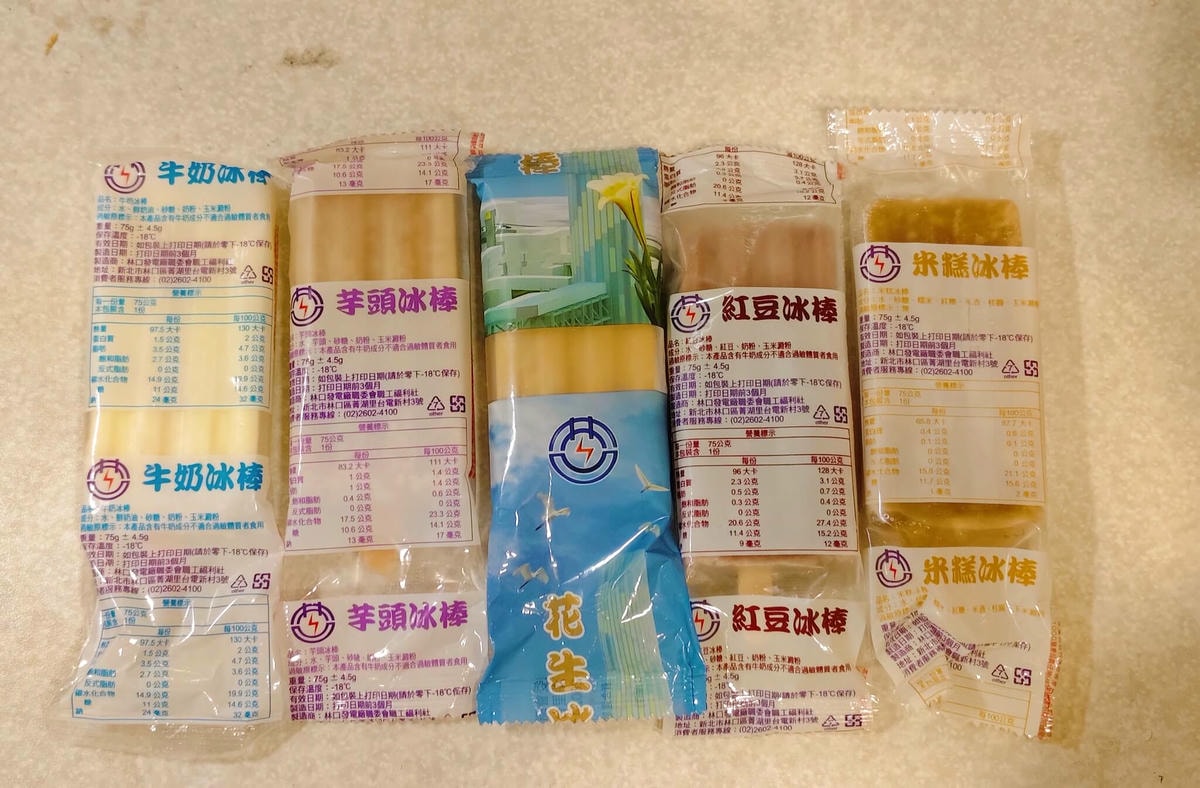 林口冰品推薦好吃又不貴「台電林口電廠冰棒」真不可思議隱藏在員工宿舍的福利社 , 就在竹林山觀音寺美食區旁 , 每年4~10月開賣 , 古早味枝仔冰一袋五枝 , 共有11種口味 , 前3名人氣王是 花生、紅豆、芋頭 , 而百香果、綠豆、牛奶、米糕、檸檬、芒果、鳳梨、洛神口味也都有各自的愛好者 , 平均每支15元起 , 內行的都搬整箱 , 現場有保麗龍箱可加購 , 一個25元 , 熟門熟路客人都自己準備保冰袋來 , 好吃不貴夏日非吃一波不可