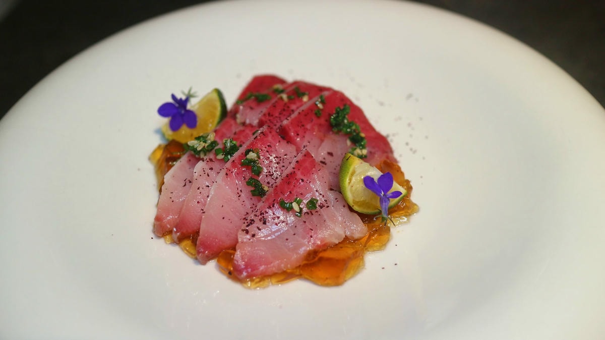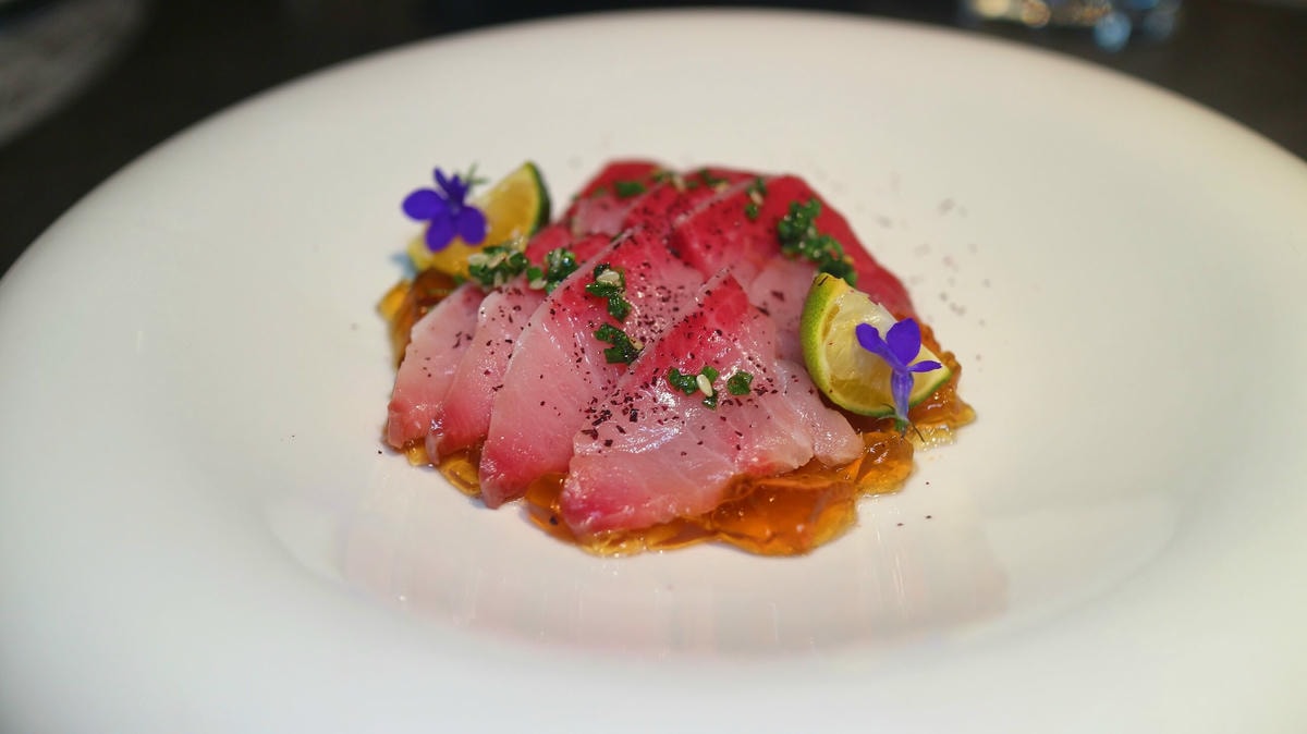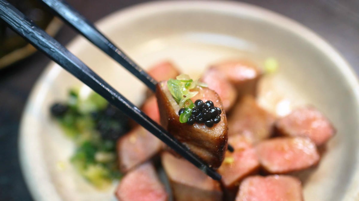 牛舌取用舌根的部位 , 在將邊緣烤至微微焦糖色 , Q中帶脆 , 吃起來肥美卻不膩 , 鋪上鹽蔥及魚子醬 , 鹽蔥的清爽與魚子醬濃郁鮮味 , 平衡了油脂鮮味與回甘 , 好吃即了
