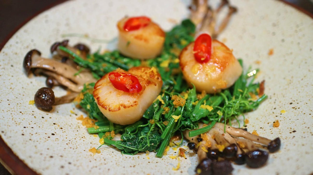 日本生食級干貝搭配鮭魚卵 日本生食級干貝干貝肉質具有彈性又鮮甜 , 搭配晶瑩剔透又黃澄亮的鮭魚卵 , 在嘴裡嗶嗶剝剝的併發開來 , 味道鮮美甘甜口感