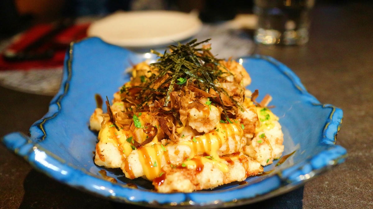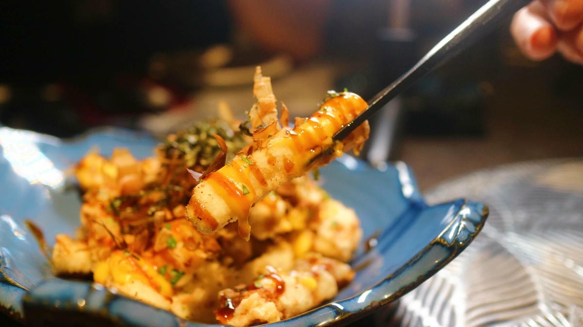 上頭淋上濃郁醇厚富層次的大阪燒醬和起司醬 , 放上海苔絲與柴魚片增添層次口感 , 用山藥來替代馬鈴薯 , 外酥脆內滑溜綿細 , 入口真有日式大阪燒口感 , 這份可以說是創意料理口感非常的特別 , 而且會一口一口唰嘴到停不下來