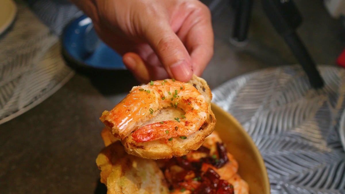 擺滿5隻大而彈牙的免剝殼新鮮草蝦 , 經煨煮鮮蝦充滿濃郁的很香 , 恰到好處的蒜香味很舒服 , 口味屬稍重一點口感 , 法國麵包沾上底下的蒜油搭配烤過的蝦子一同享用 , 夠味好吃
