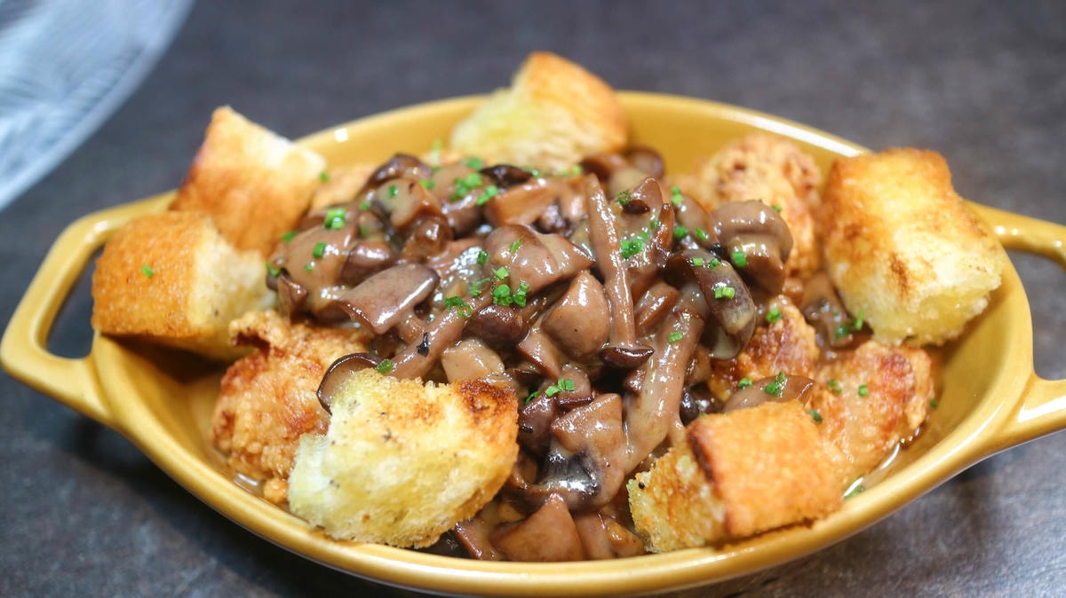 烤到酥香土司拿在手上不會油 , 和一咬下肉汁會汩汩流出雞肉 , 及非常軟嫩多汁菇菇 , 一同入口熱呼呼的吃香氣立馬竄出太香了 , 他們的Sauce有一點像義大利麵白醬那種香濃 , 小美忍不住一口二口的拿來吃