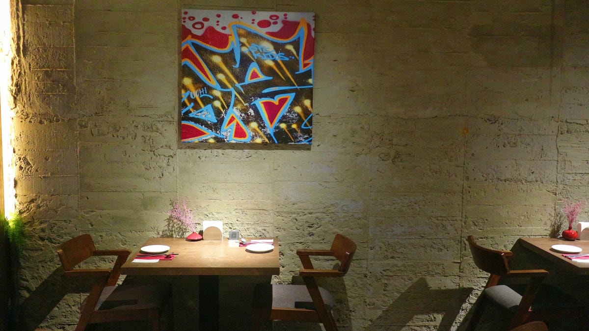 店面外觀十分低調 , 內部用餐空間不大 , 但工業風粗胚牆讓環境顯得沒壓力 , 以木質、清透玻璃等元素 , 打造出內歛的視覺效果 , 與沉穩靜謐的用餐氣氛