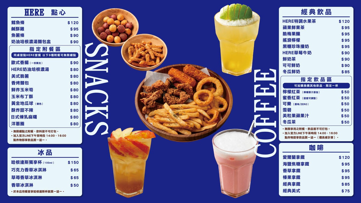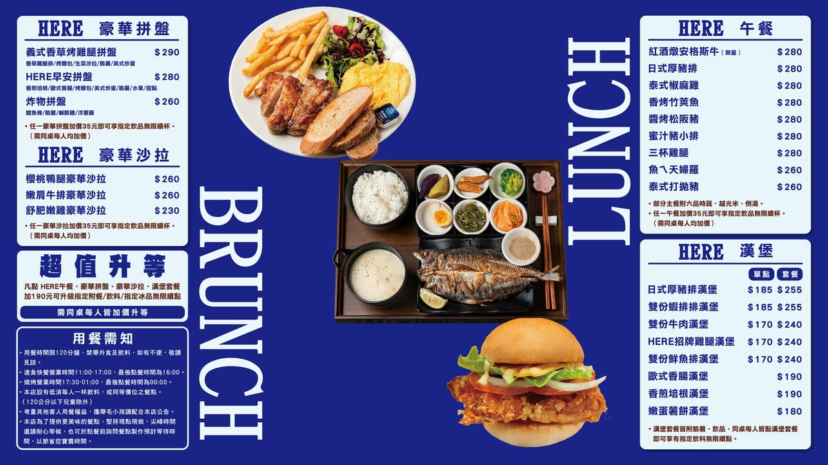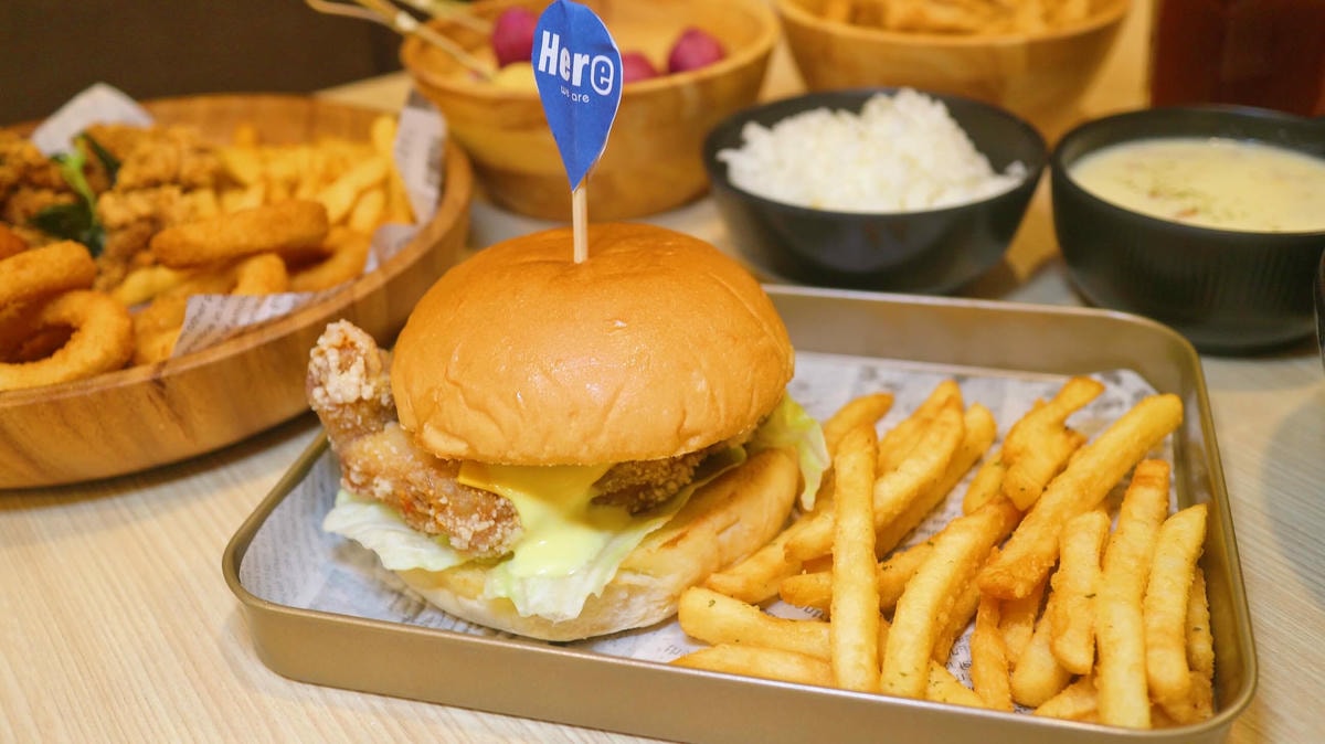 「Here café 大安店」店內餐點品項很多元選擇 , 有早午餐商業午餐、拼盤、沙拉 、炸物、漢堡應有盡有 , 招牌炸物推薦加菜必點 , 菜色多都具不同的特色又豐富口感 , 親子友善加上不限時間 , 除了適合聚會聊天外也可以包場舉辦活動求婚、舉辦派對都是很推薦的地點選擇!