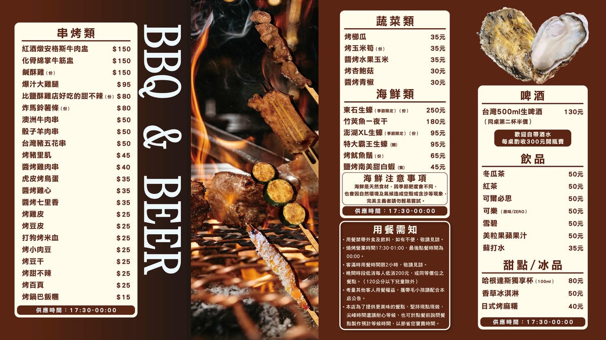 尊饗套餐吃到飽只供應到晚上20:00(最後點餐是19:30),另晚上17:30增加平價燒烤及啤酒單點(詳如圖片菜單),營業到晚上12:00時,提供給喜歡吃消夜的朋友