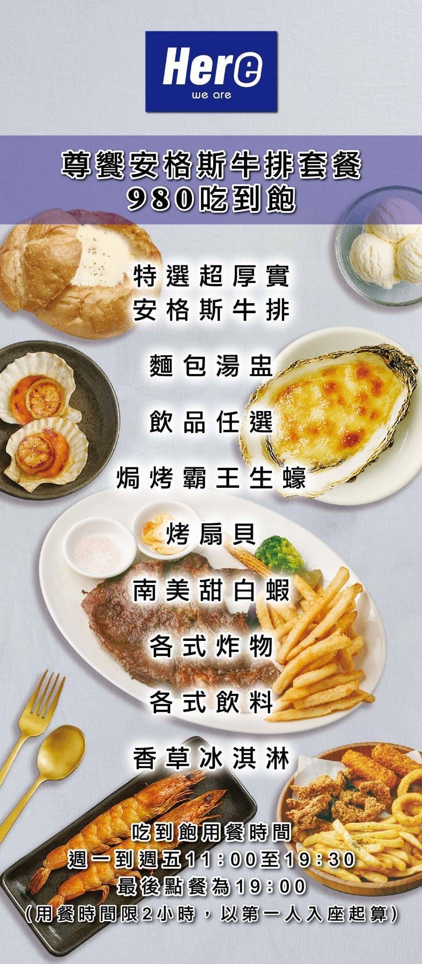 尊饗套餐的安格斯牛、麵包盅、飲品、扇貝、白蝦、超大焗烤霸王生蠔、烤蝦、扇貝、安格斯厚切牛排、麵包盅湯、各式炸物及飲料 , 通通無限供應