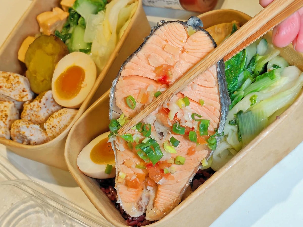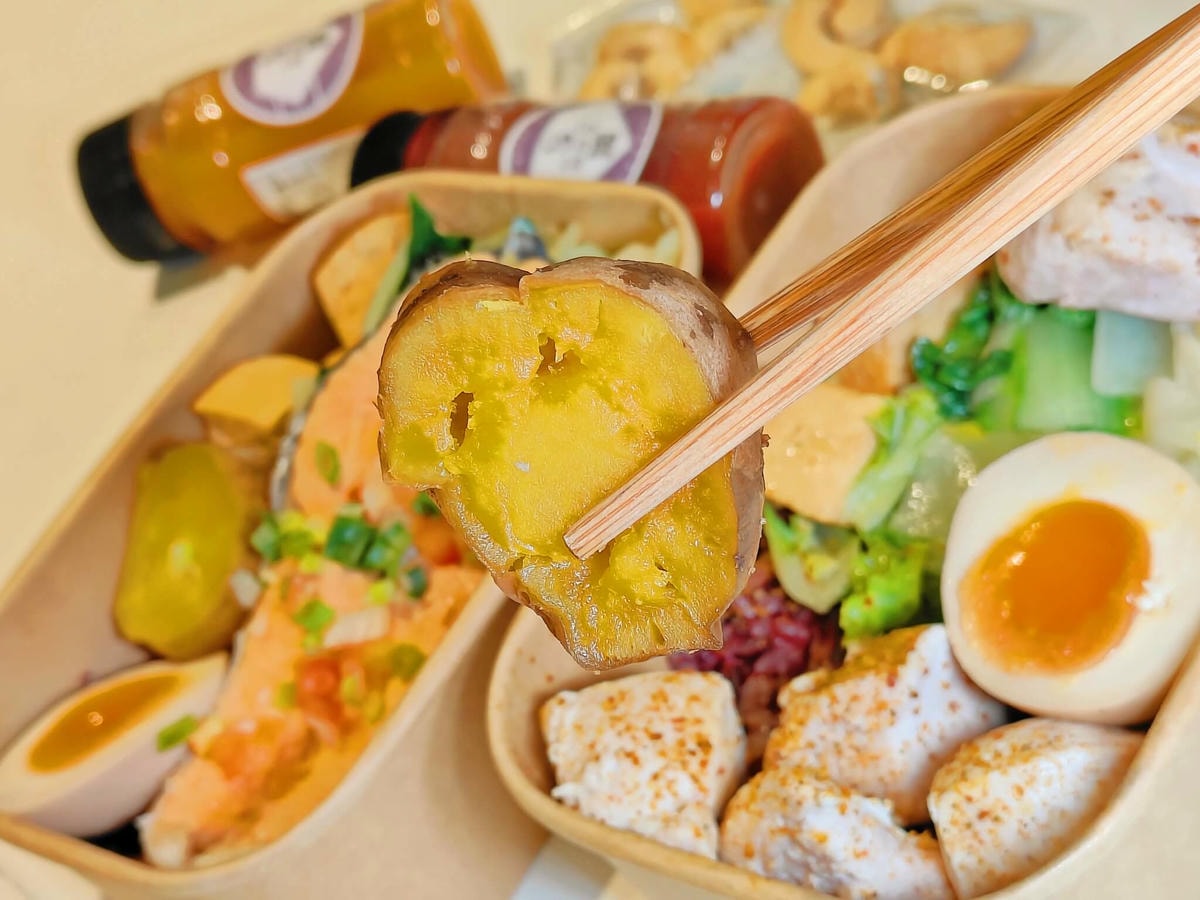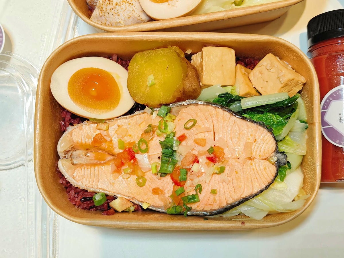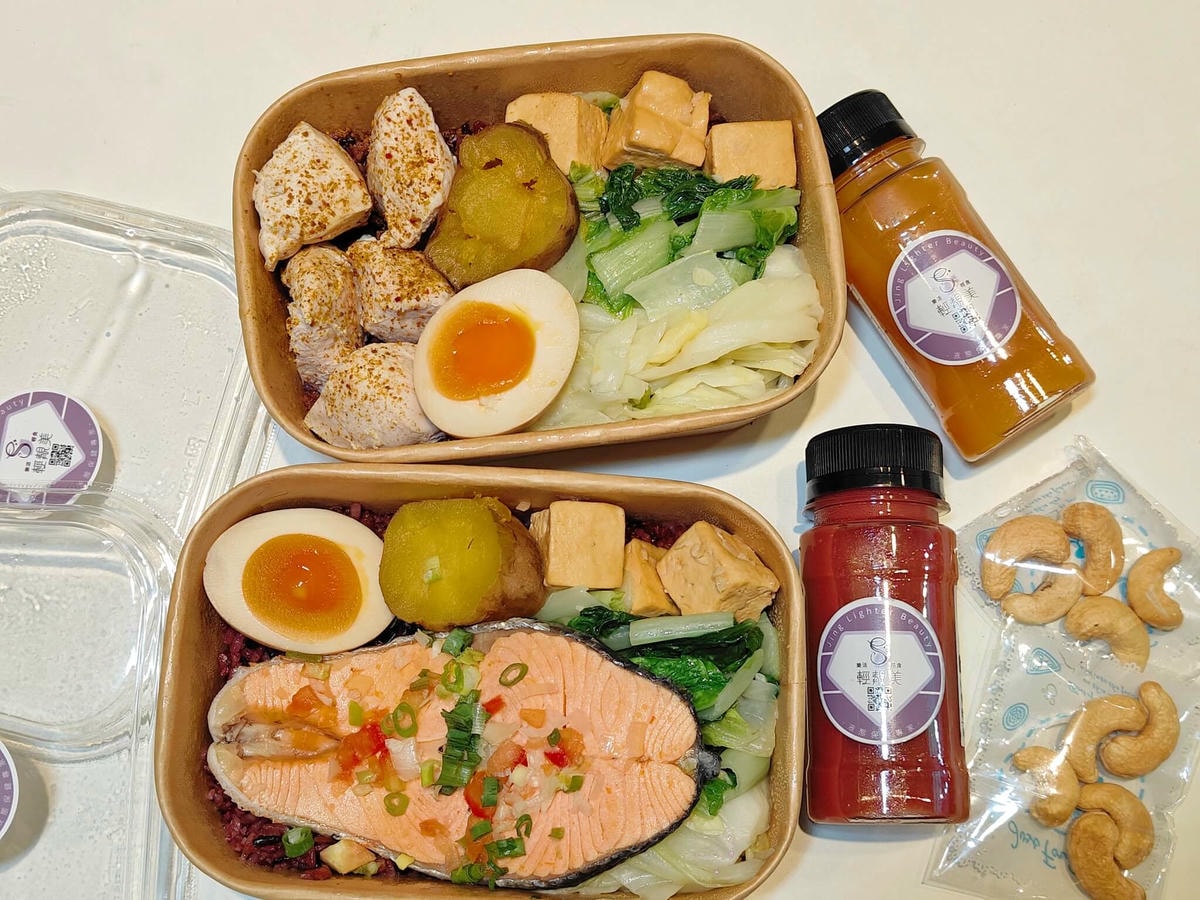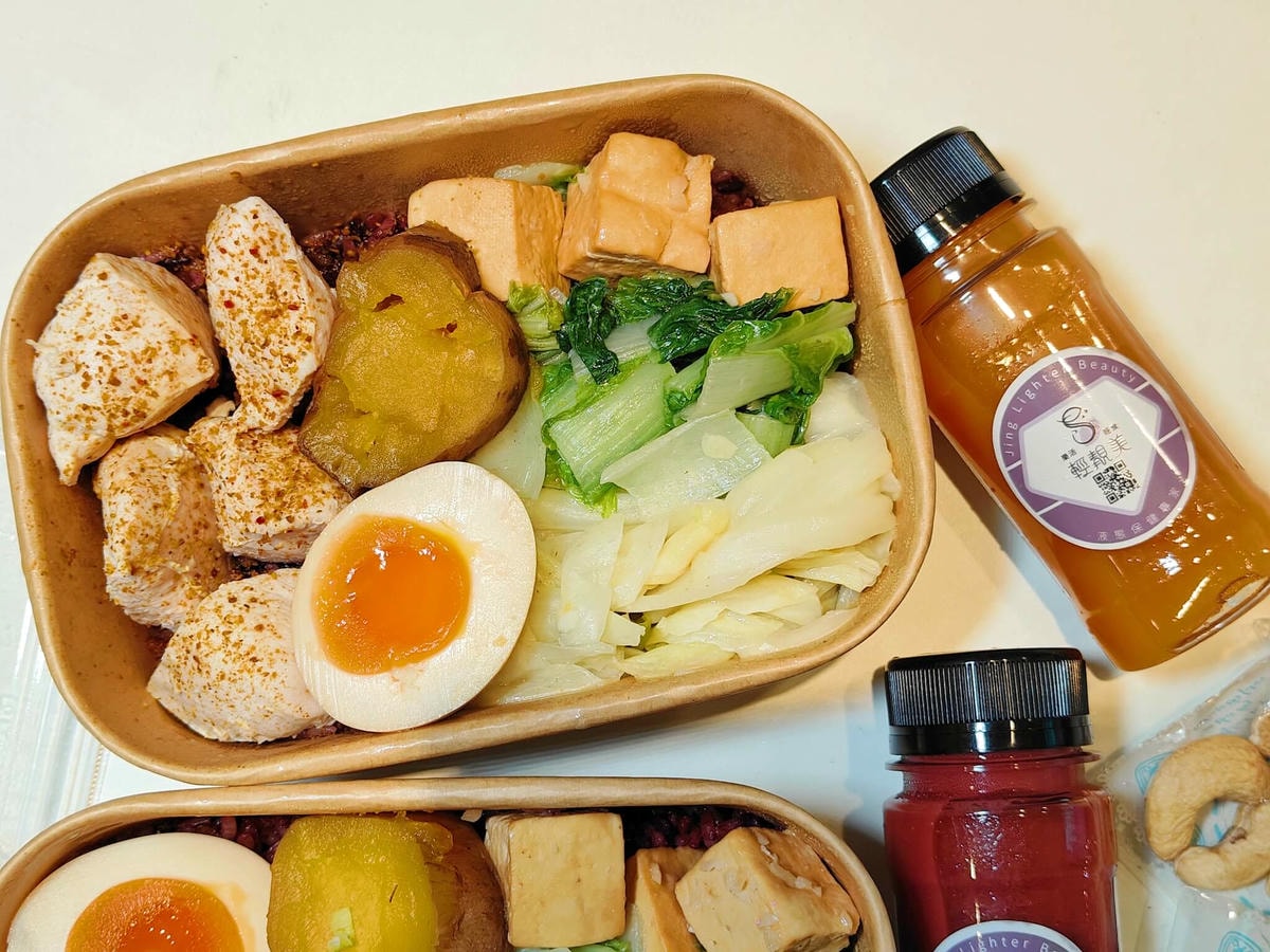 輕靚美健康餐盒80起的售價真的不貴 , 還可以加價升級成套餐 , 多了蔬果飲、堅果包吃的喝的一次滿足 , 地瓜、溏心蛋、時蔬、黑米飯、堅果包都能再做額外加點