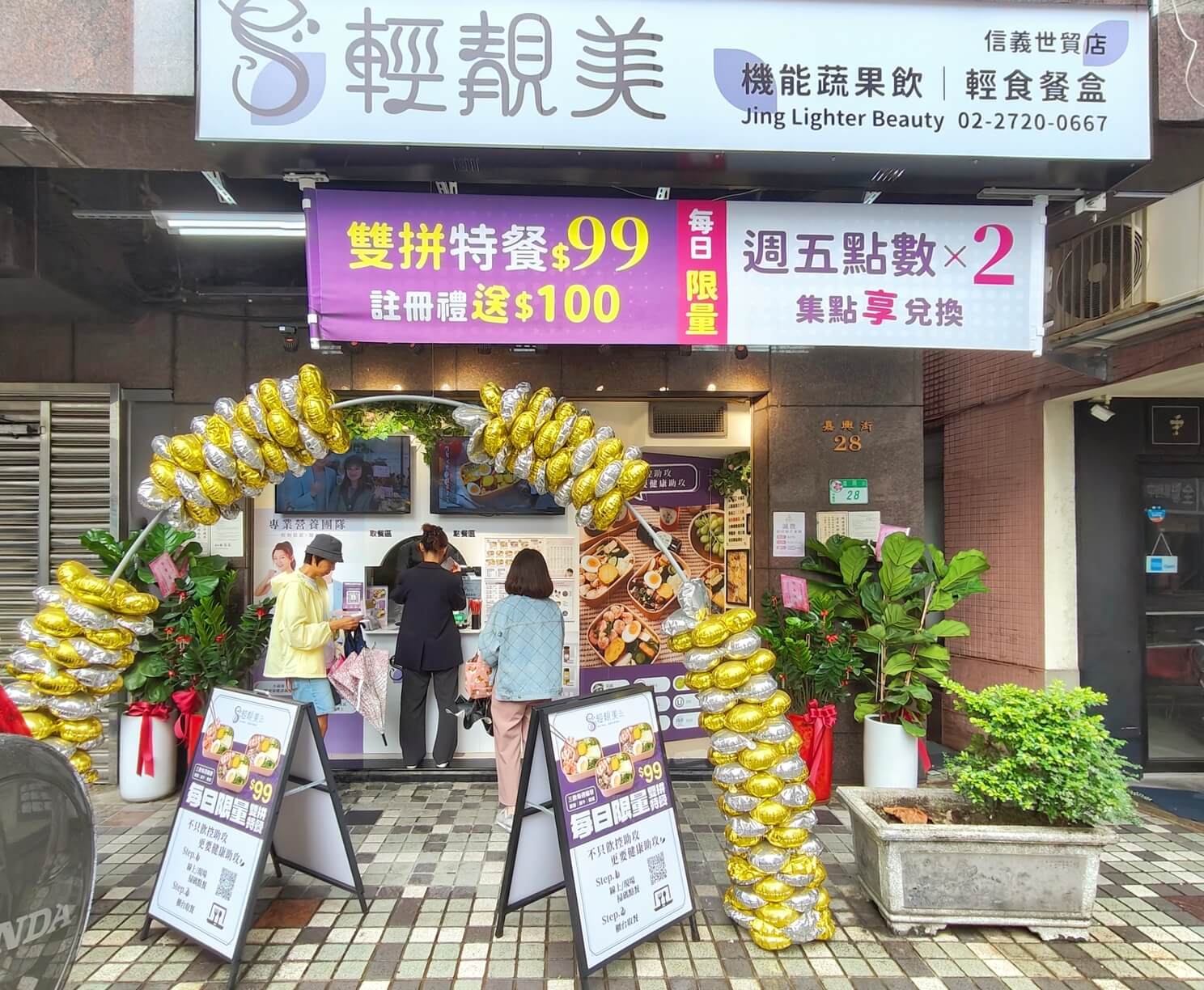 輕靚美 信義世貿店是一間外帶店 , 位在台北市信義區嘉興街入口處 , 從捷運101站2號出口出來 ,步行約5-6分鐘左右即可抵達 , 附近光復南路626號有個停車場也算方便 , 鄰近通化夜市、熱鬧的信義區 , 就座落在商辦學區午餐便當可以就都是全包下 , 開業不是太久就在網路上累積好評口碑