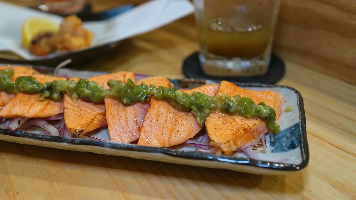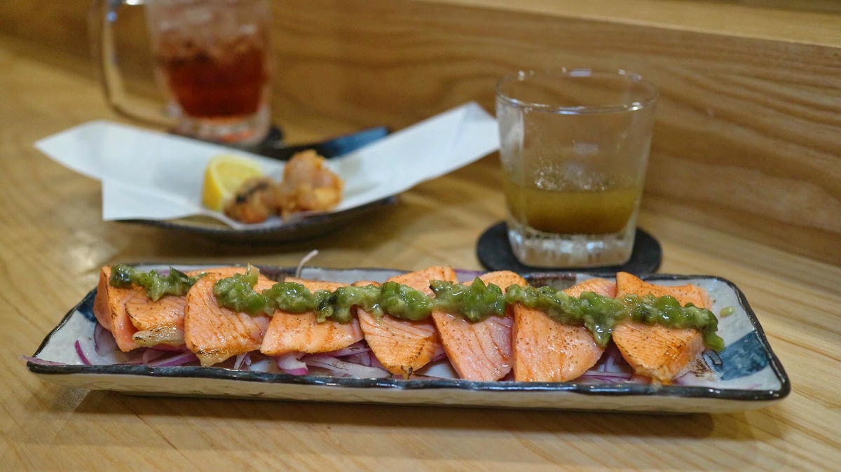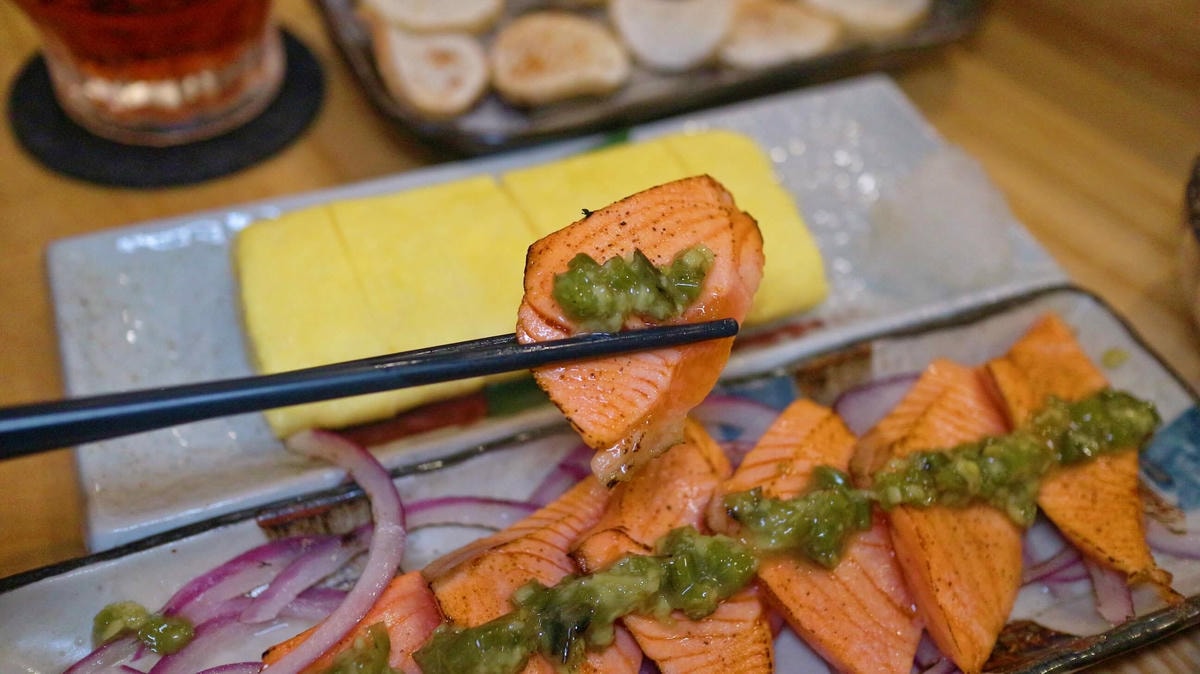 鮭魚肉質與油脂連綿唇齒 , 時不時竄出的香蔥香氣 , 豐厚油脂香氣更上層樓 , 精緻巧思 , 很棒的下酒菜!