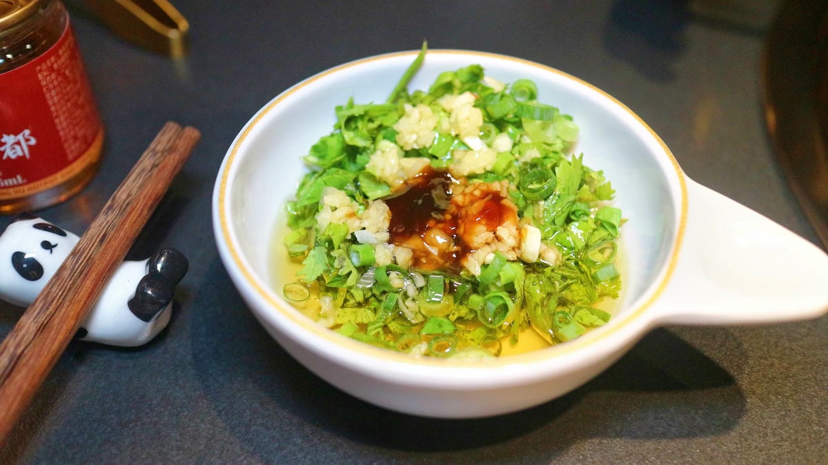 每桌每位都會提供一罐四川成都原裝進口香油 , 服務人員會主動訊問 , 需要幫忙調一碗有香菜、蔥花、蠔油的調料 , 再來就是打開香油倒入 即可