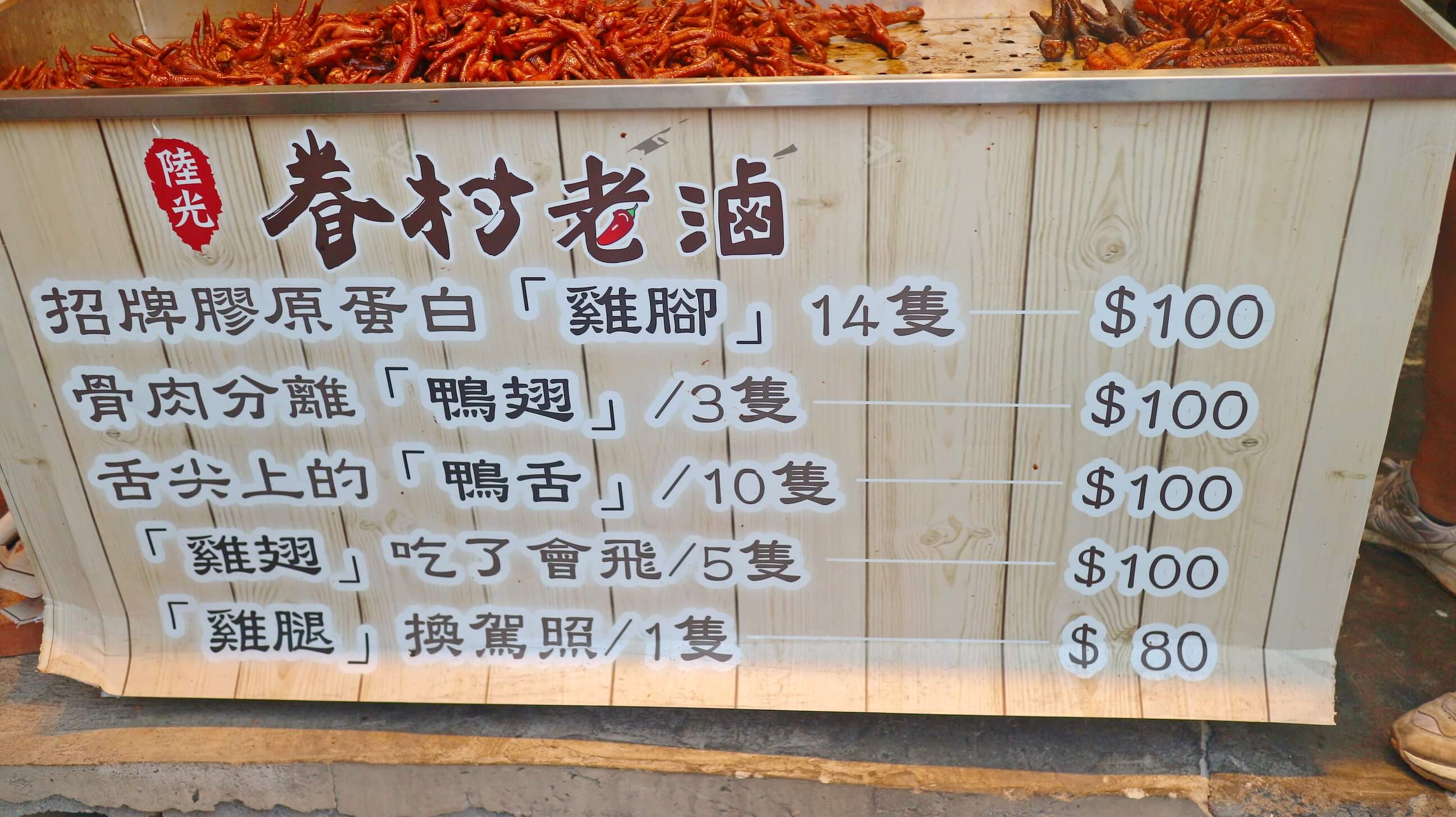 陸光眷村老滷基本上每一款滷味都100元 , 大雞腿80元 , 加入獨門調配醬汁 , 熱氣騰騰的出鍋陣陣的迷人香氣 , 吊足我的胃口啊
