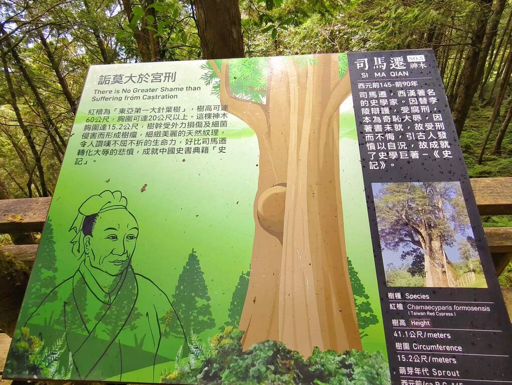棲蘭馬告神木園中每一棵神木 , 園區內共有51棵千年神木,均以中國歷代人物命名,巧妙地將樹齡與歷史時代連結 , 除了司馬遷,還有如孔子、顏真卿、唐太宗等著名人物也成為了神木的命名依據