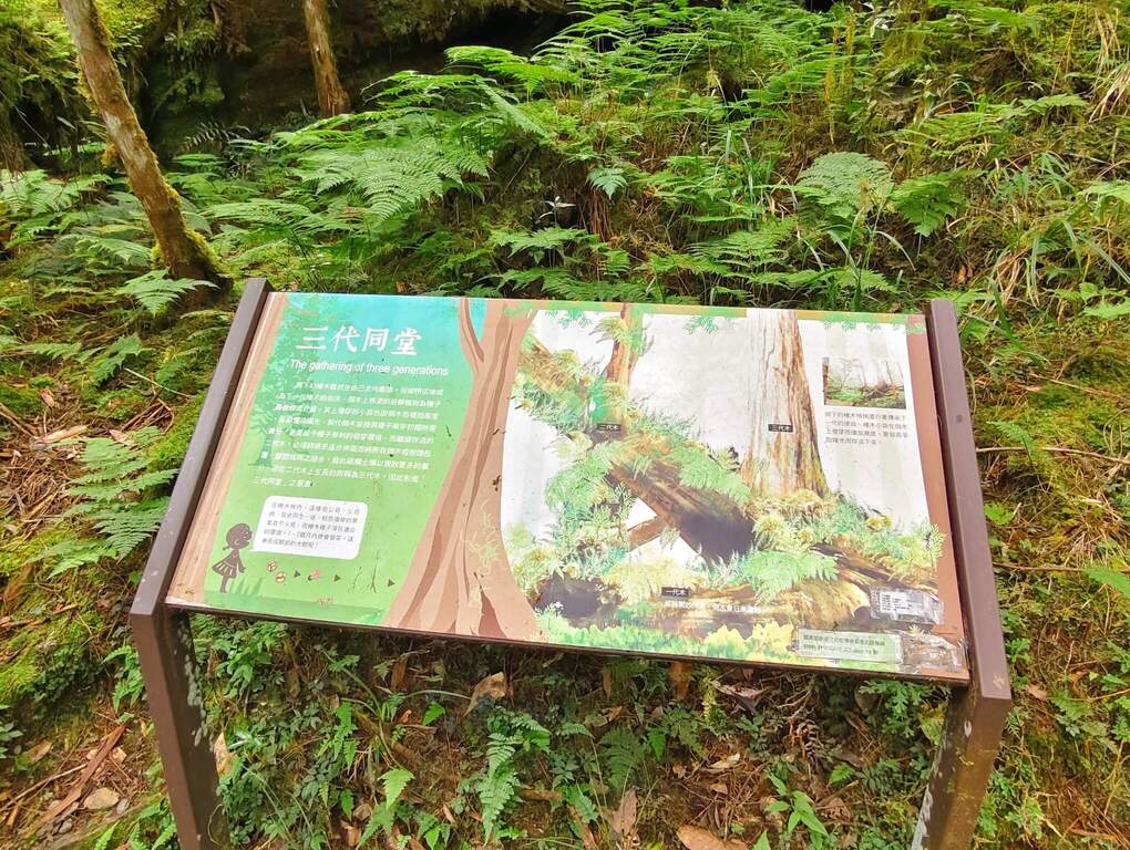 三代同堂神木指的是一棵倒下的神木上,先是由其倒木的養分長出第二代的樹苗,再由這第二代枯木上長出第三代的樹苗,形成從同一根系或枯死母體上長出三代後代樹木的特殊自然現象