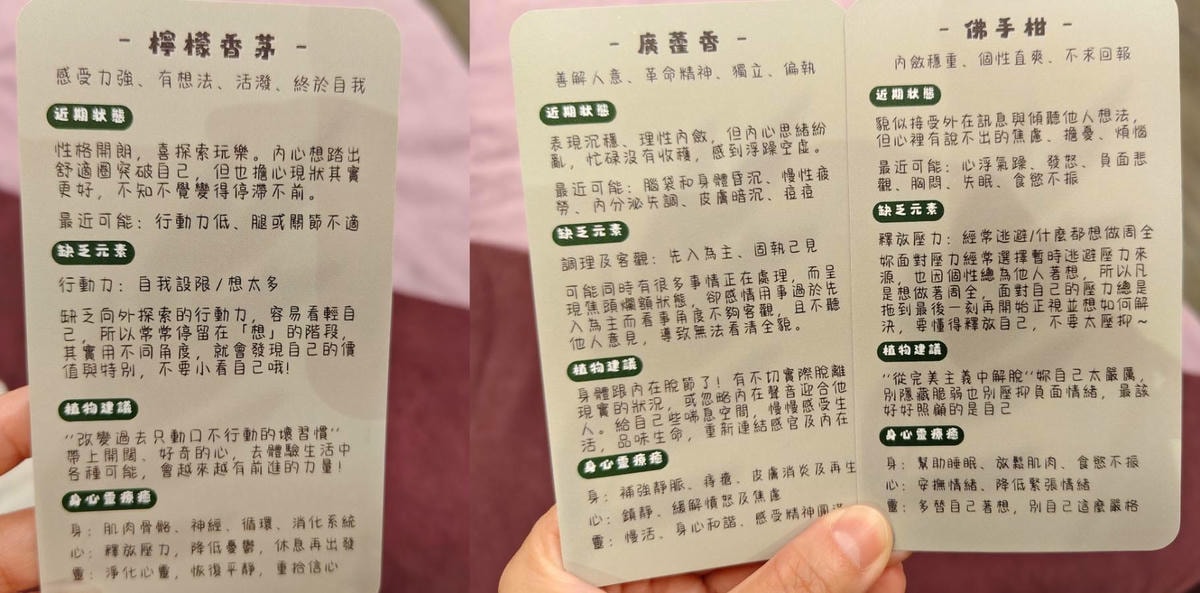 按摩開始前 , 還有很特別的精油抓周 , 會先用左手抽出3支 ,適合今日能量的精油 , 精油分別可以顯現自己近期的內外在狀態跟建議 , 當天抽到的精油真的都跟我很像(可以看看下方的解讀小卡) , 超級神奇的!