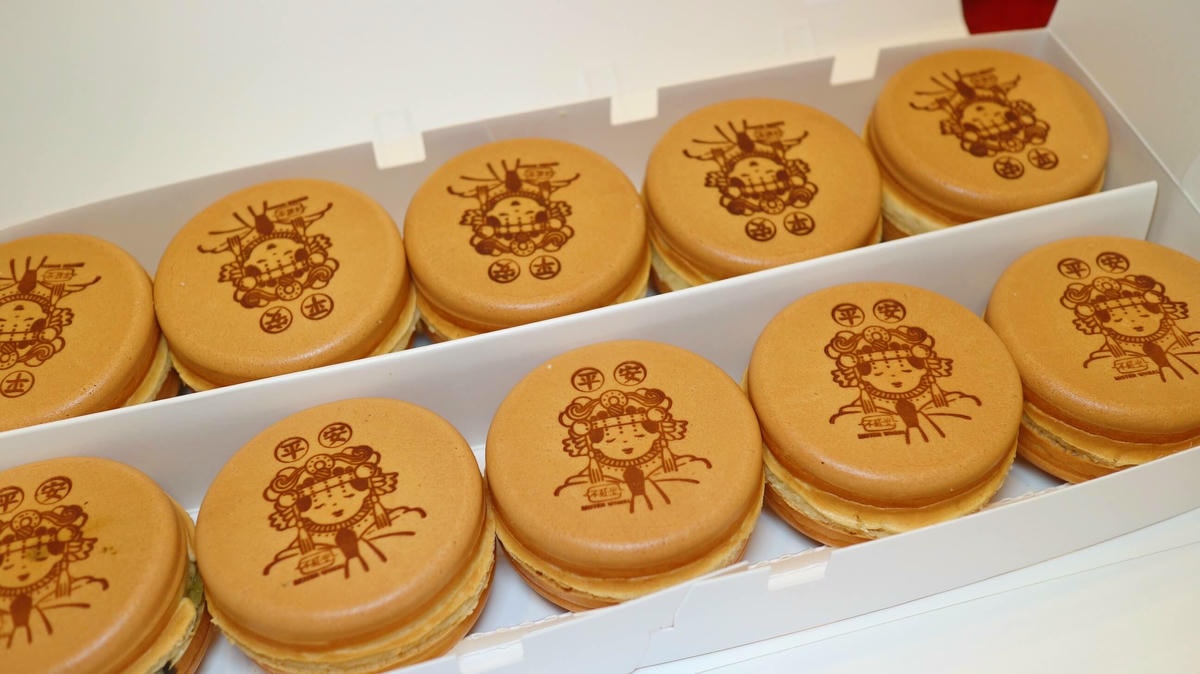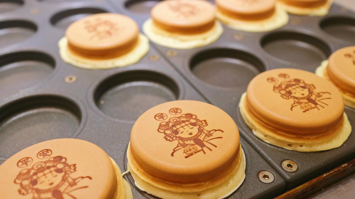 烙印上Q版媽祖車輪餅 , 在一旁的真的好療癒人心 , 客製化烙印會依照不同的節日來變換不同的圖樣 , 來看看影片更清楚