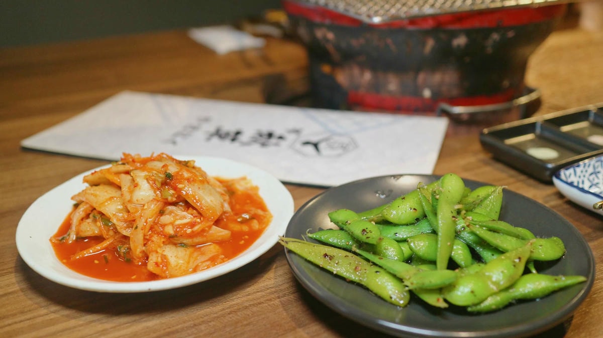 點完餐之後 , 店家還會再送上兩盤小菜 , 泡菜與毛豆 , 天啊 ~ 都是開胃及下酒小菜耶! 泡菜酸香爽脆 , 粒粒脆口毛豆還可以吸允黑胡椒鹹香 ~夠味好吃 , 越吃越涮嘴