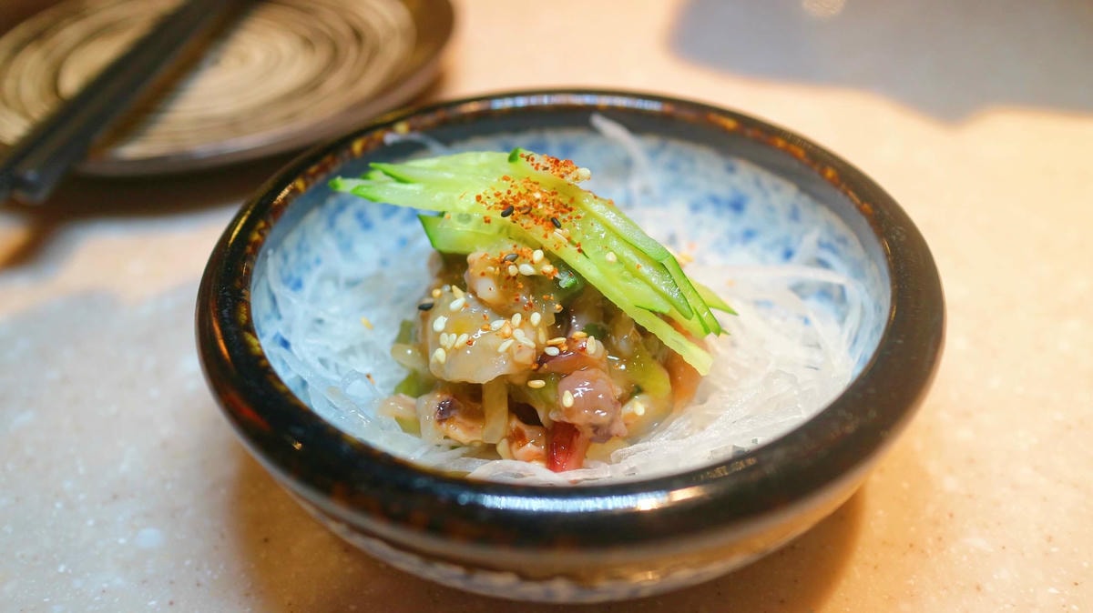 芥末章魚 鮮度極高 , 入口清脆爽口 , 鮮嫩彈牙 , 日本經典的下酒小菜 , 推薦必點的一道