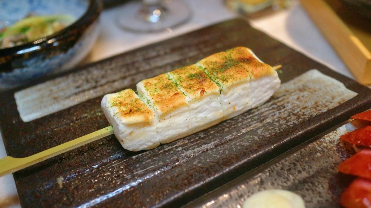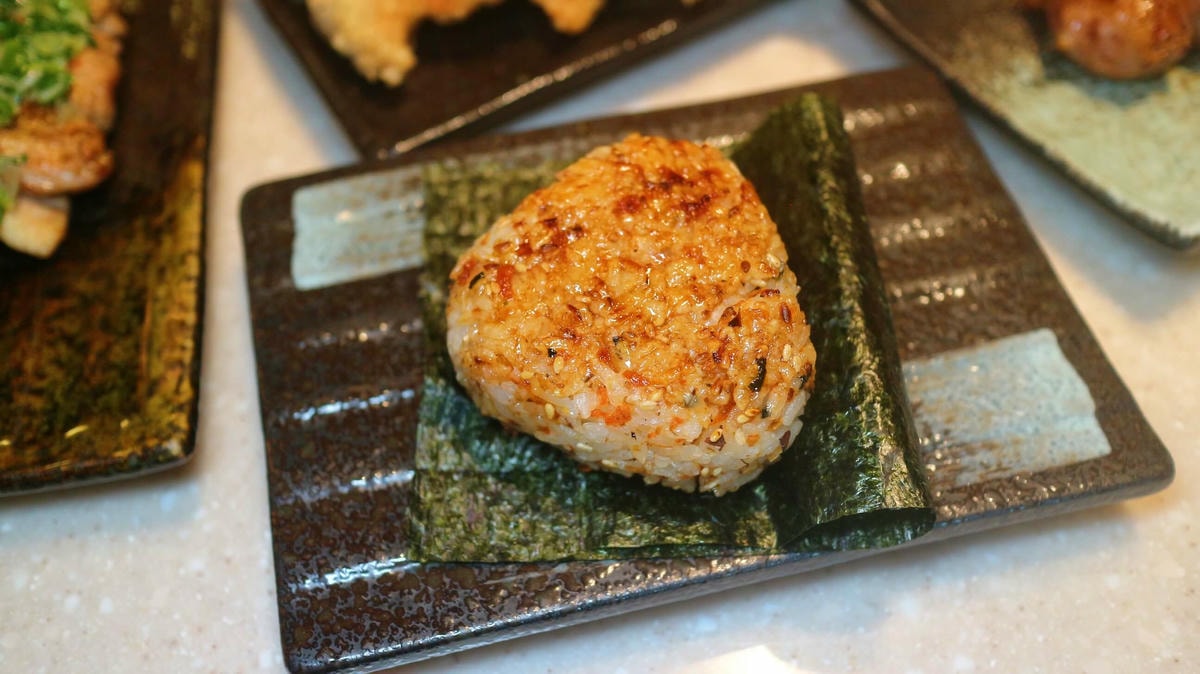 日式烤飯糰 外層烤得微脆 , 裡頭依然有著米飯的綿密感,搭配海苔口感更上一層樓 , 吃了會很有飽足感!