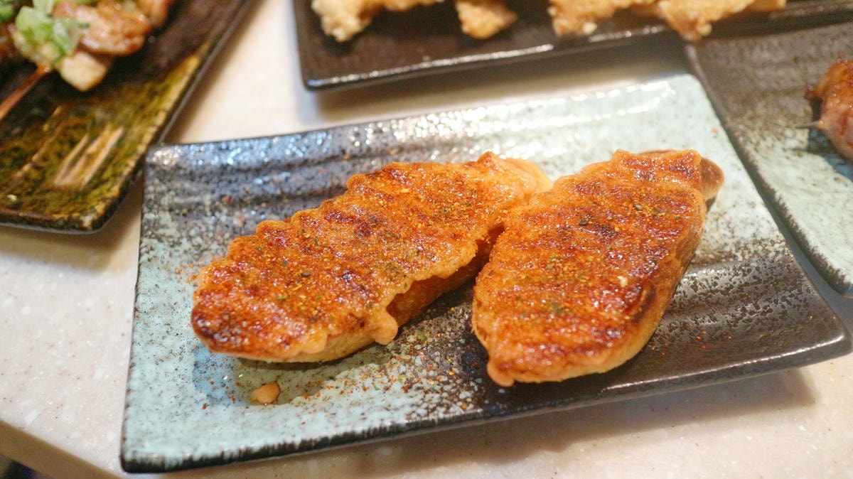 明太子雞腿串 厚厚的雞腿肉鮮嫩多汁 , 上面鋪滿了厚厚的明太子醬 , 甜美濃郁 , 讓雞腿可口層次很豐富 , 好吃!