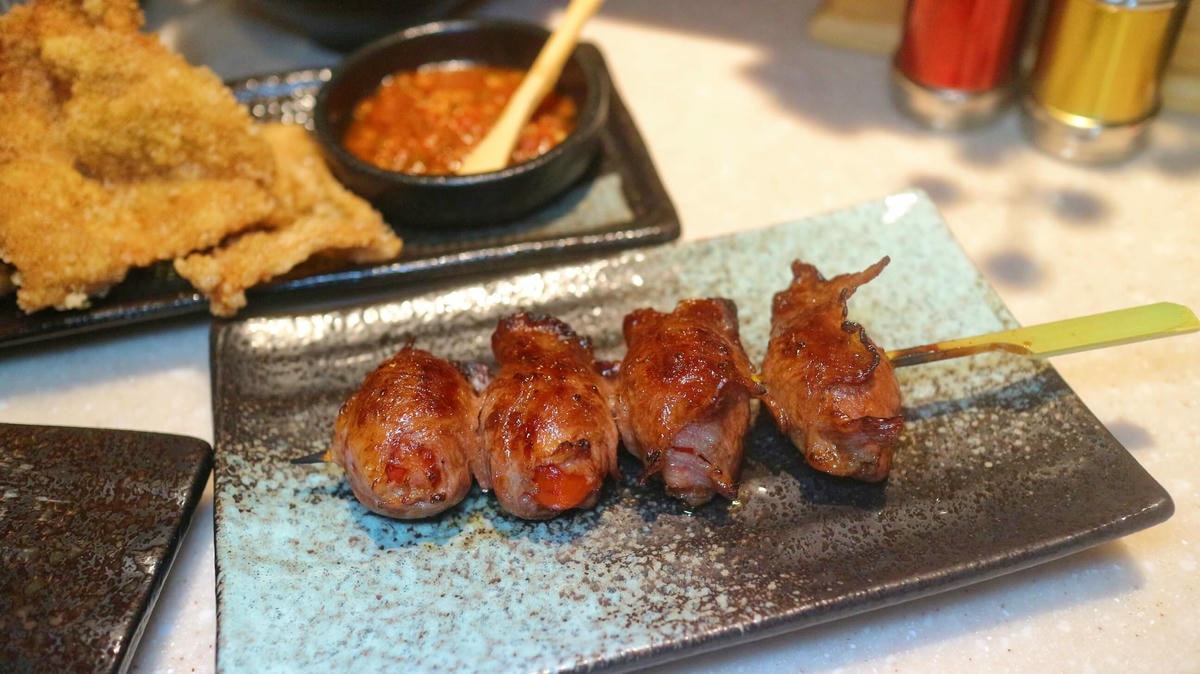 帶広牛捲小蕃茄 蕃茄 捲進牛肉片 , 當你一口咬下 , 蕃茄整個炸開 , 加了水果吃起來更juicy , 更爽口 , 還很解油解膩 !