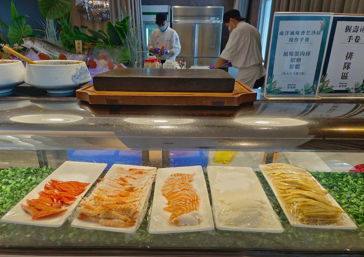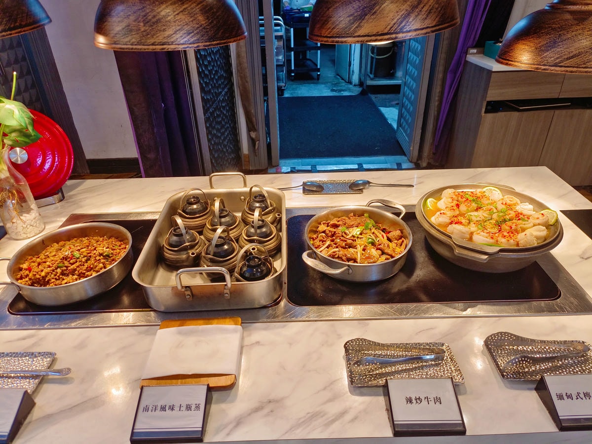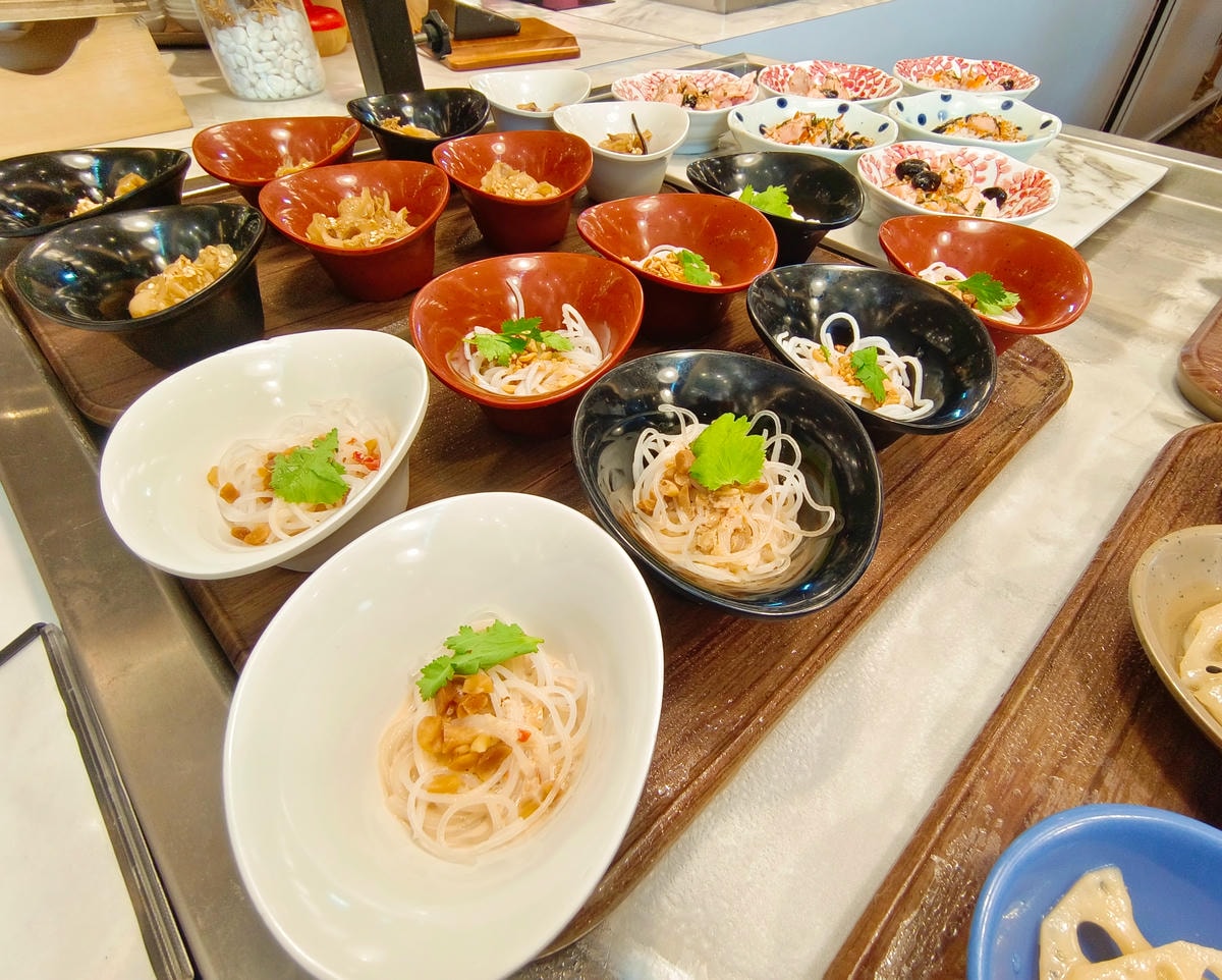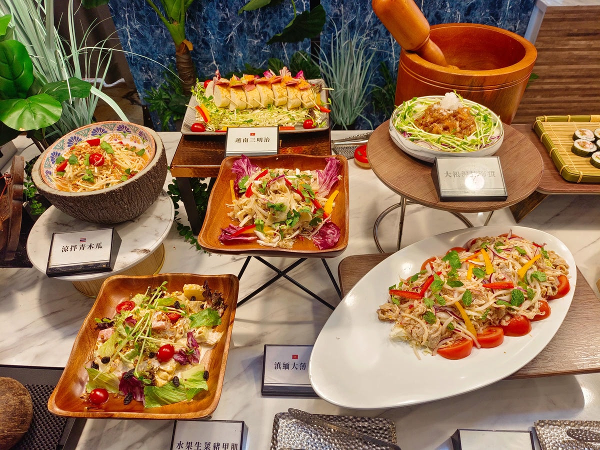 還有一些東南亞風味 , 涼拌冷盤好澎湃哦 , 大根泥拌哲絲 , 越南三明治 , 滇緬大薄片 , 涼拌青木瓜 , 水果生菜豬里肌 , 這區酸辣好吃也是很熱門的一區哦…我一拍完照就好多人在這區夾 , 等我再去夾時都快被掃光光了