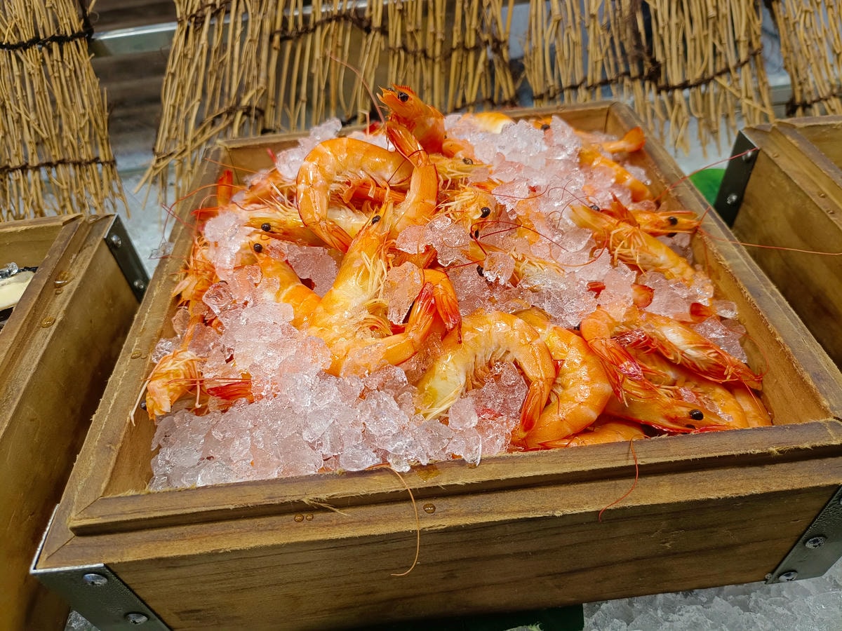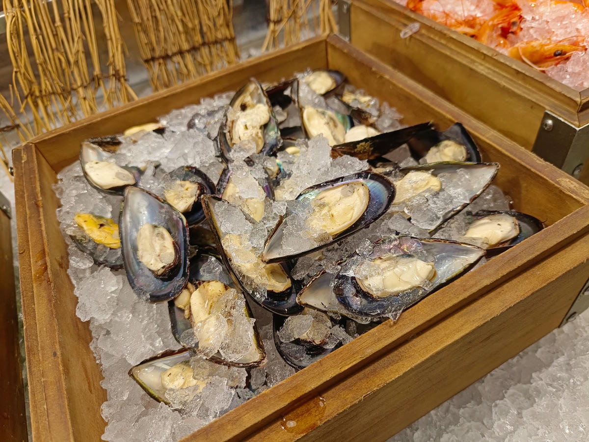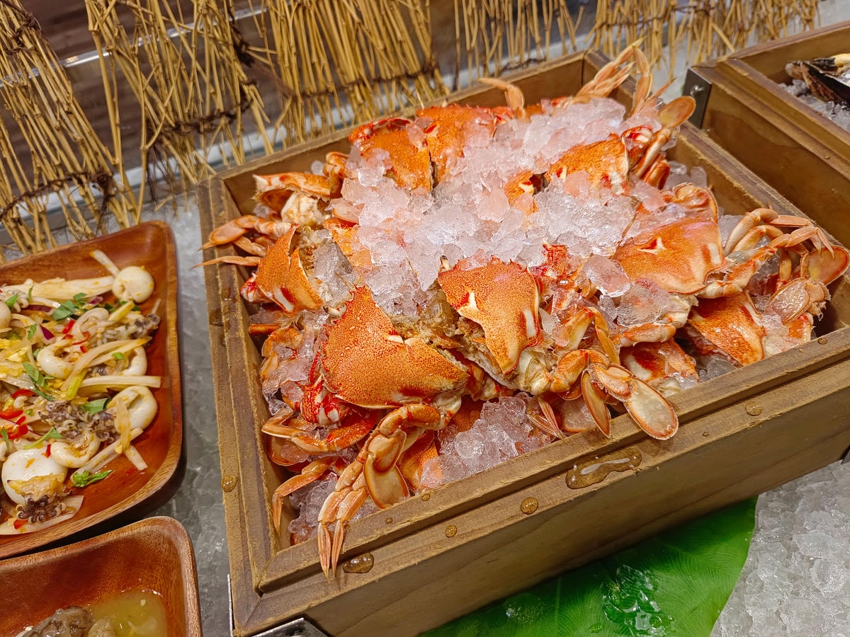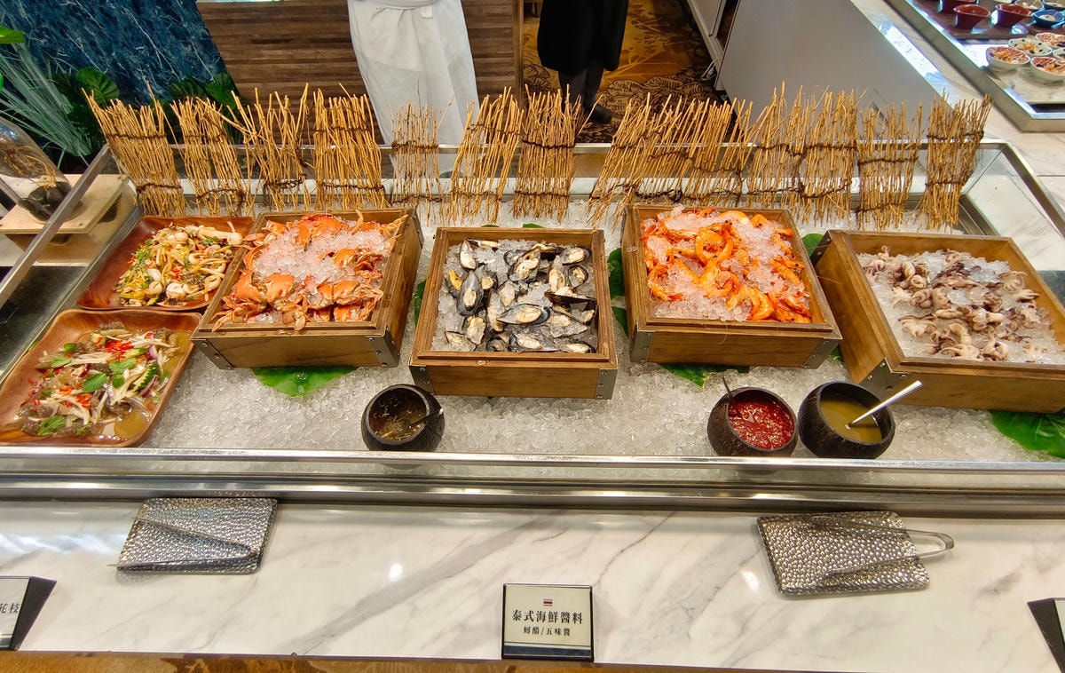 海鮮冷盤區 拿完生魚片再順道繞過來夾取海鮮 , 螃蟹 , 蝦子 , 淡菜 , 小章魚 , 香輕辣小花枝 , 等海鮮