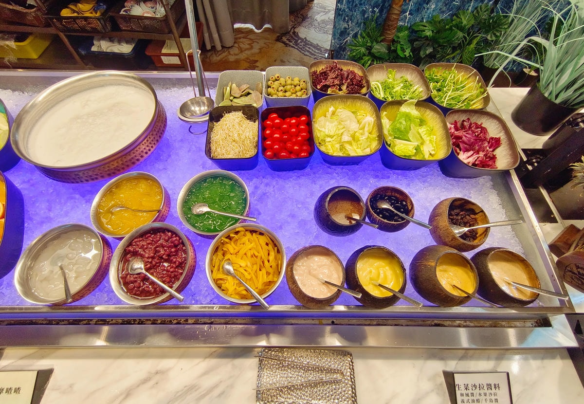 生菜沙拉蔬菜新鮮 , 摩摩喳喳料好多 , 我什麼都想吃什麼都加 , 裝的大大碗心滿意足走回位子大嗑起來
