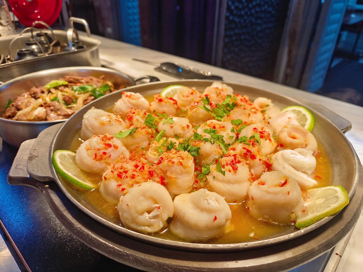 一次拿好拿滿 , 不用一直走去拿 , 不小看小美拿這幾盤 , 吃下來一輪也是蠻飽 , 辣炒海瓜子看起來紅紅的很辣的樣子 , 不過實際吃起來還好 , 重口味的海瓜子好好吃 , 緬甸式檸檬魚又厚又大 , 入口即化湯汁滿滿 ! !