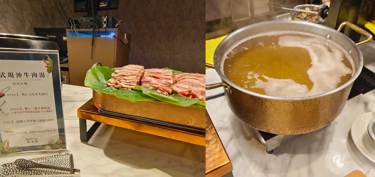 越式現沖牛肉湯 , 這可以自己來 , 夾2~3片生牛肉片放入碗中 , 淋上一匙牛骨原湯 , 依個人喜好加入薑絲和蔥花 , 就完成囉