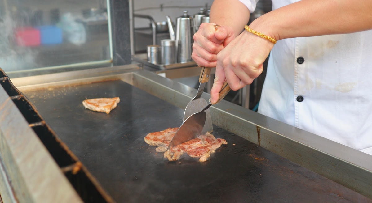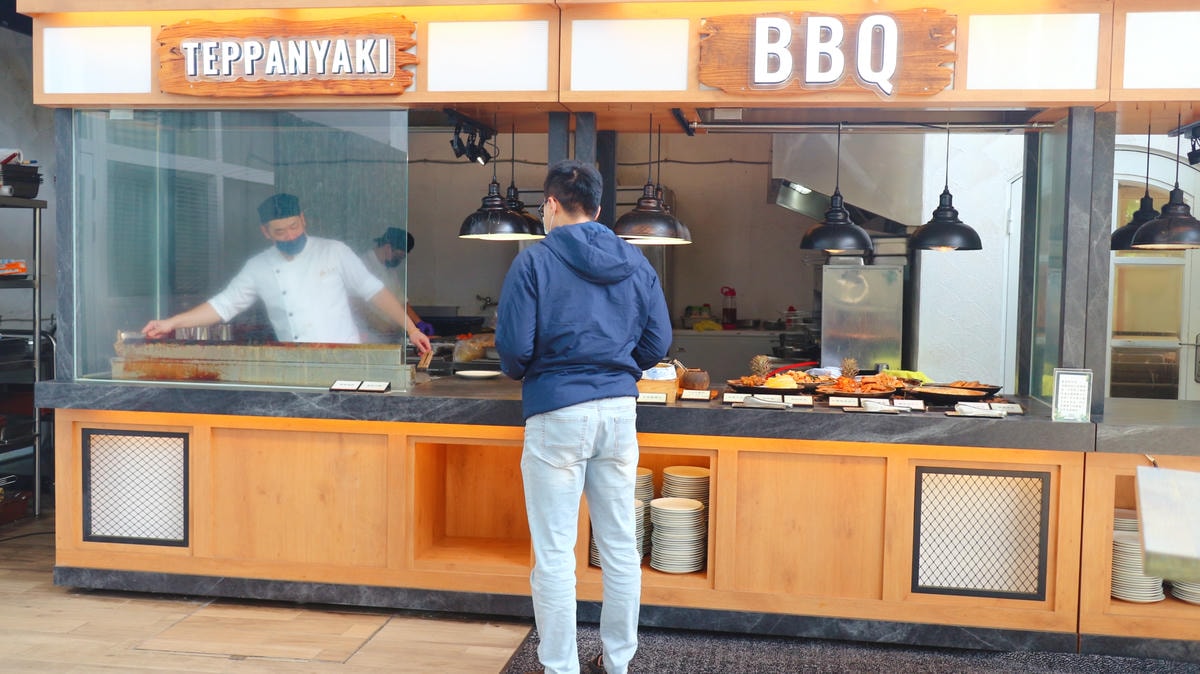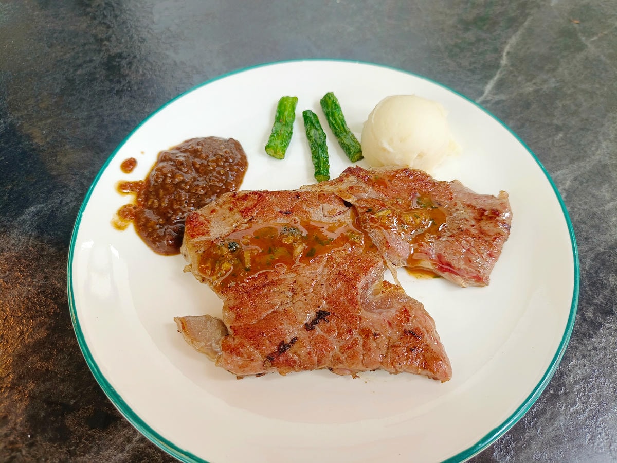 現點現煎豬排、牛排 , 直接跟廚師點 , 我點了牛排剛好沒有人 , 旁邊烤物夾一夾也差不多好了 , 真的幸運 …
