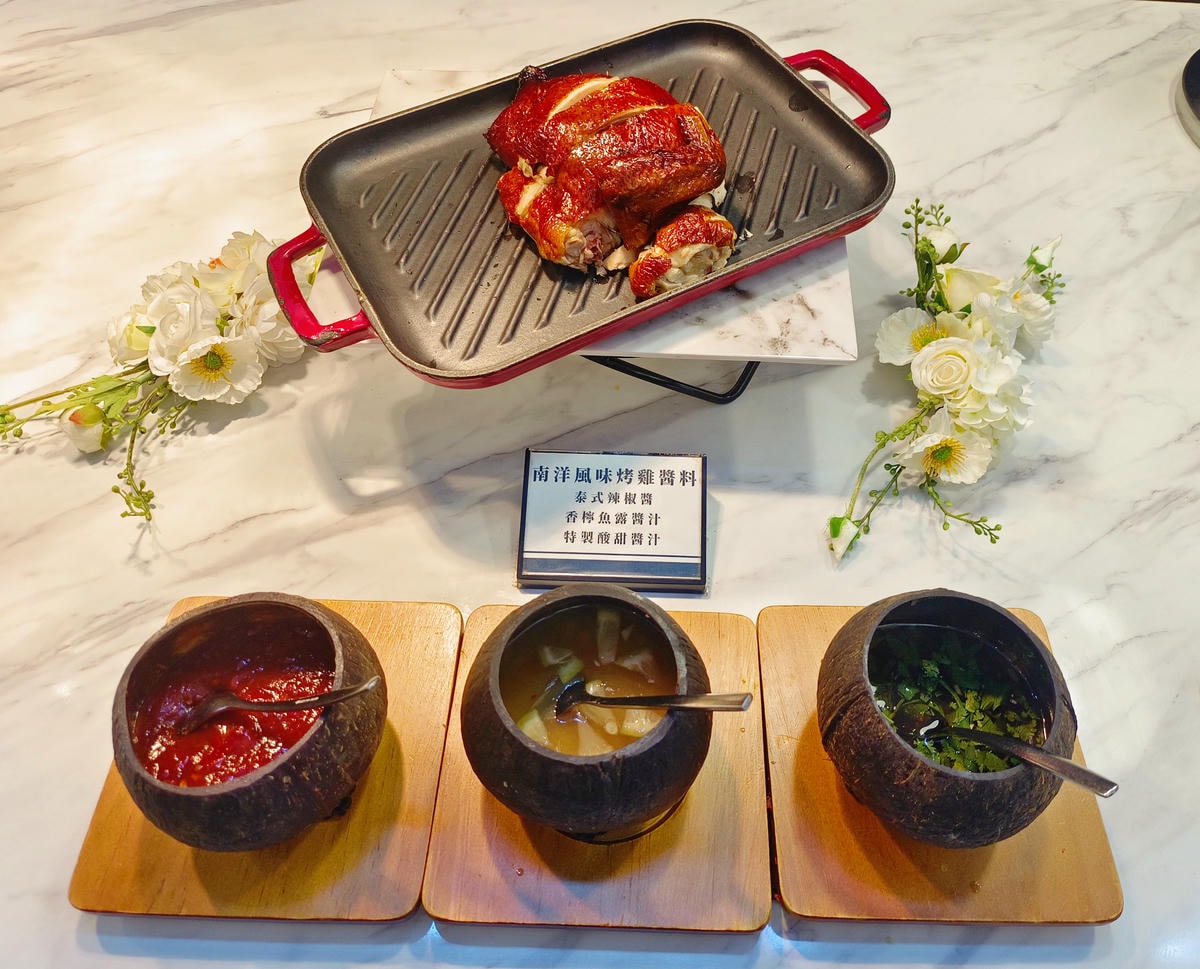 南洋風味烤雞 , 醬料有3種泰式辣椒醬 , 香檸魚露 , 特製酸甜醬 , 各有各的美味 , 我個人是喜歡 特製酸甜醬