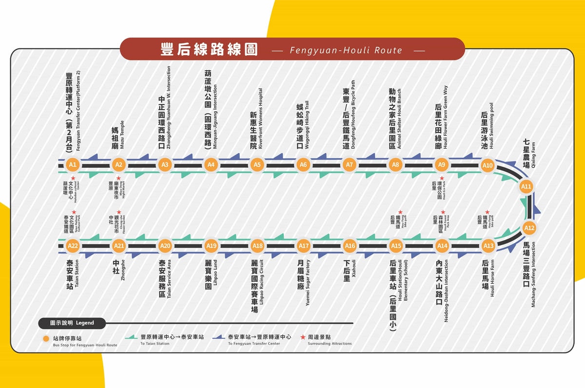 台灣好行888豐后線搭乘地點 , 有豐原轉運中心站和泰安車站 , 小美是在搭乘巴士到豐原轉運中心站在轉乘888豐后線出發旅行 , 行駛路線上面都寫得很清楚 , 大家可以參考一下