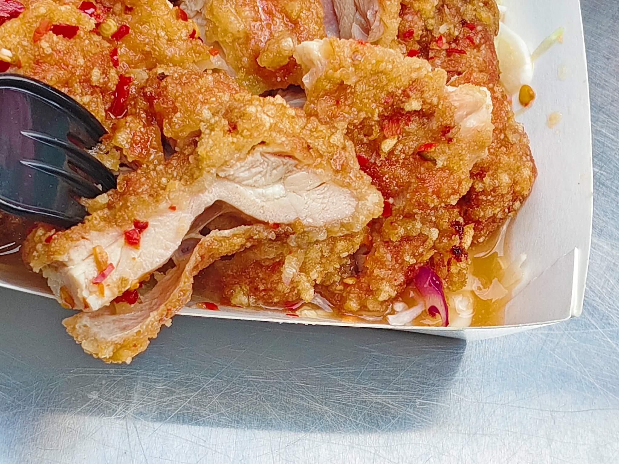 使用完整一隻超大去骨雞腿排下去沾粉 , 份量和泰式餐廳一樣大份 , 可以說是真材實料 , 相當有誠意