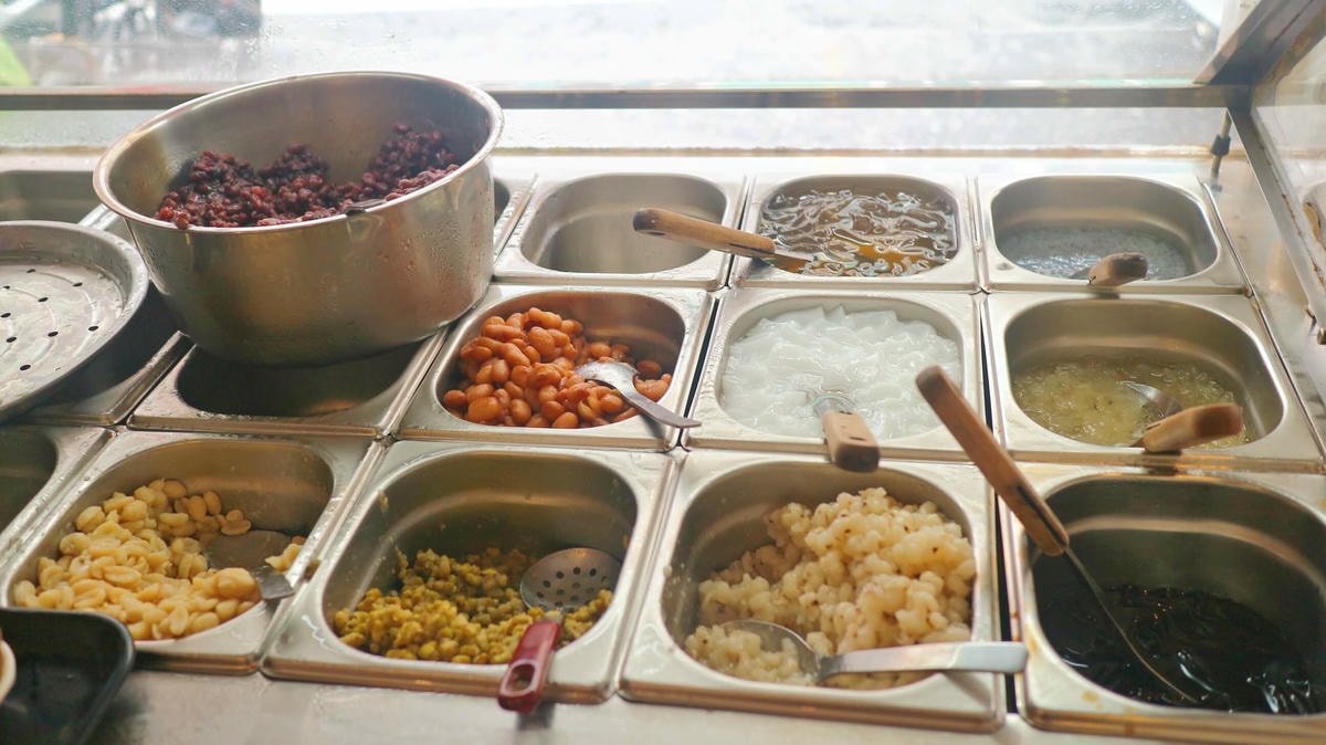 料滿多的 , 菜單有豆花冰、甘蔗汁熱豆花、薑汁熱豆花、燒仙草、原味冰品項 , 一碗可以搭配三種配料 , 每碗統一價格55元 , 選好餐拿到白色餐車結帳在選3種料即可 , 就等待叫號自助取餐